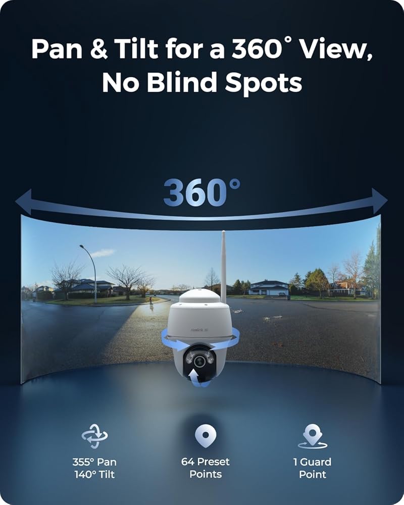 360 درجة تغطية ونقطة مراقبة: مع مقلاة 355 درجة و 140 درجة ، لا تضمن هذه الكاميرا اللاسلكية في الهواء الطلق أي بقع عمياء في مراقبة الممتلكات الخاصة بك. قم بتعيين نقطة مراقبة مخصصة في التطبيق ، وستعود الكاميرا إليها تلقائيًا بعد الانحراف ، مما يوفر تغطية ثابتة لمحيط أمان منزلك.