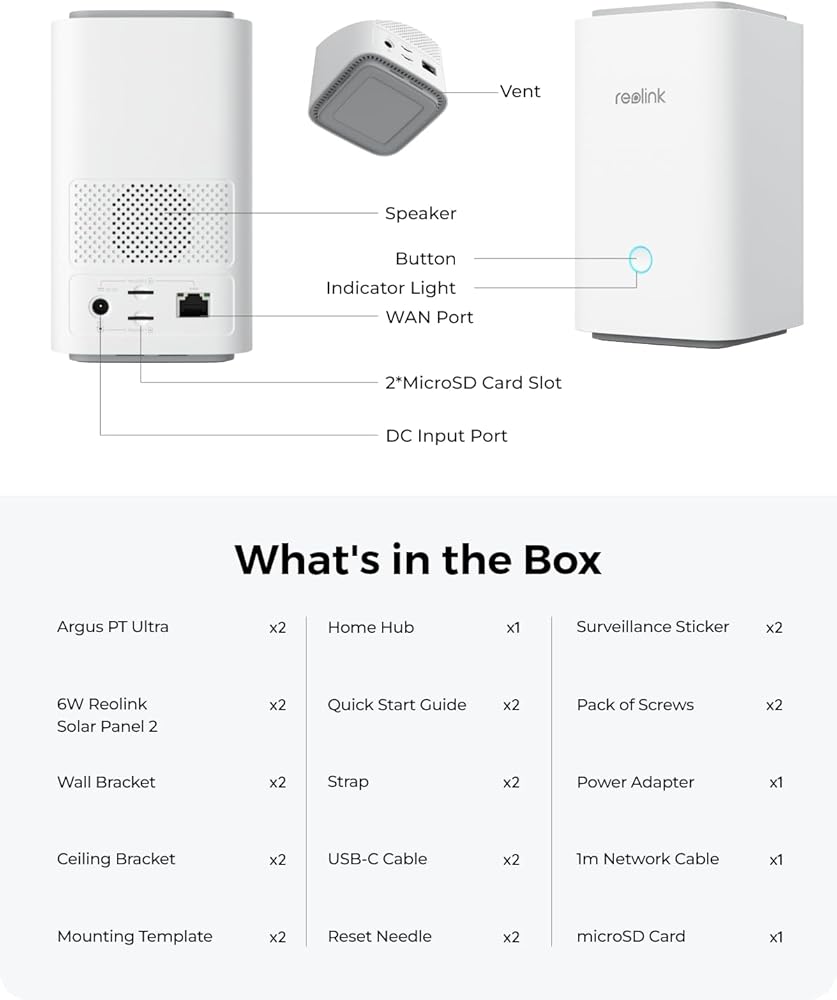 Reolink 4K Solar Security Cameras Wireless Wireless Outdoor System ، 360 ° PAN و 140 ° TILT ، الكشف عن الحركة الذكية ، 2.4G/5G Wi-Fi ، تخزين محلي مشفر ، لا توجد رسوم شهرية ، Home Hub مع 2x Pt Ultra Cam Kit