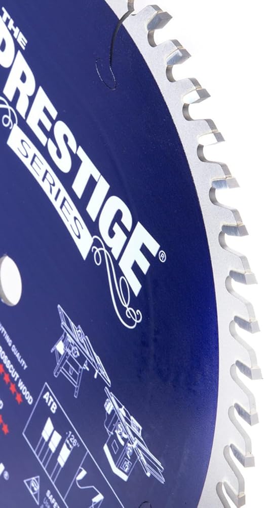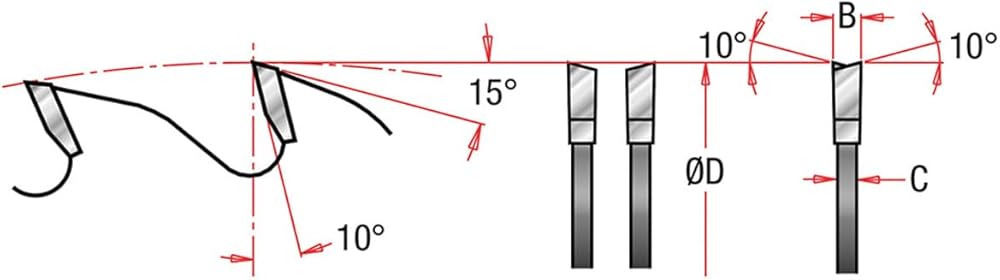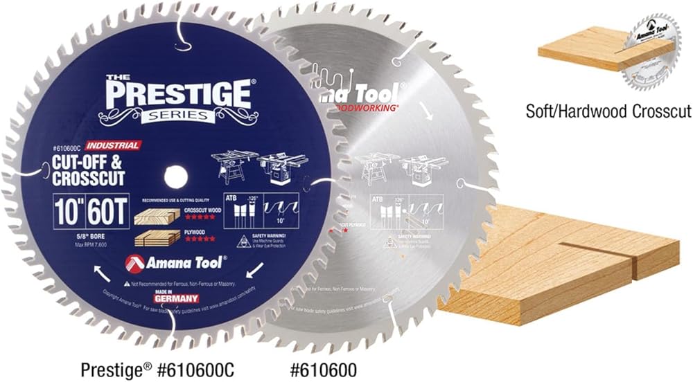As our standard Cut-Off and crosscut blade, This is ideal for table saws and sliding Table saws. Its combination of 10° hook and the alternate top bevel tooth grind provide good-quality cuts and a long cutting life.Suitable for hardwood, softwood, even plywood and chipboard. Good choice for heavy production in any cabinet-making shop, #610600C, (D) diameter: 10 (250mm), teeth: 60, (D) bore: 5/8, tooth grind: ATB, hook angle: 10°, kerf (B): .126 (3.2mm), Plate (C): .087 (2.2mm), 610600C electro-blue carbide Tipped Cut-Off and crosscut 10 inch dia X 60T ATB, 10 deg, 5/8 Bore, Non-Stick coated