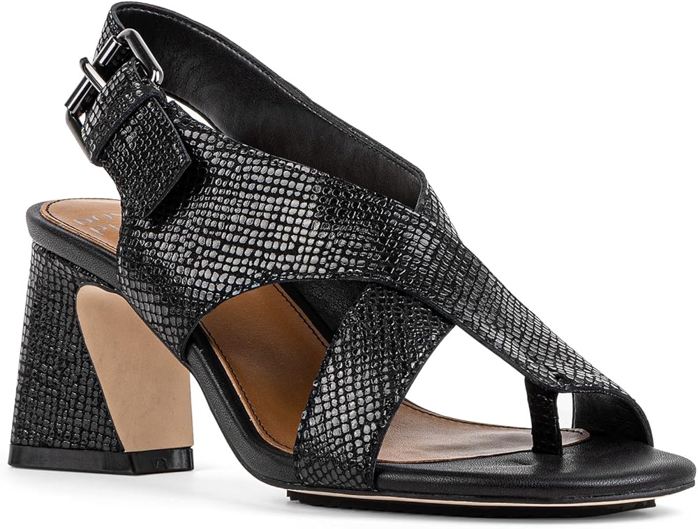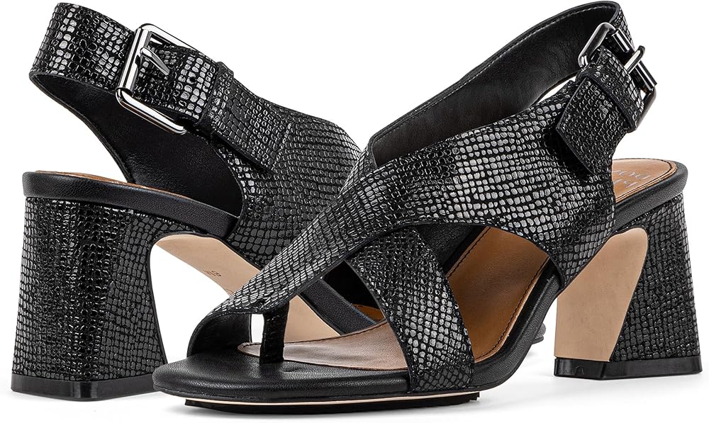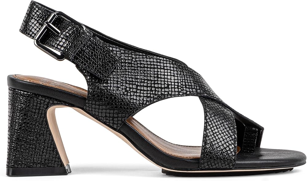 Cross over into sexy sophistication with the EDWIN heeled sandal. This bold block heel made from pebbled metallic leather features a crisscross upper, an adjustable buckle closure and a toe post for a secure fit. Memory foam padding cushions the insole, and a flexible outsole with a rubber forepart gives you added traction.