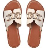 - صندل شرائح جلدية للنساء المصممة مع فرقة واحدة ، وزينة معدنية ذهبية ، وكتلة ملونة ، وأحذية المشي غير الرسمية