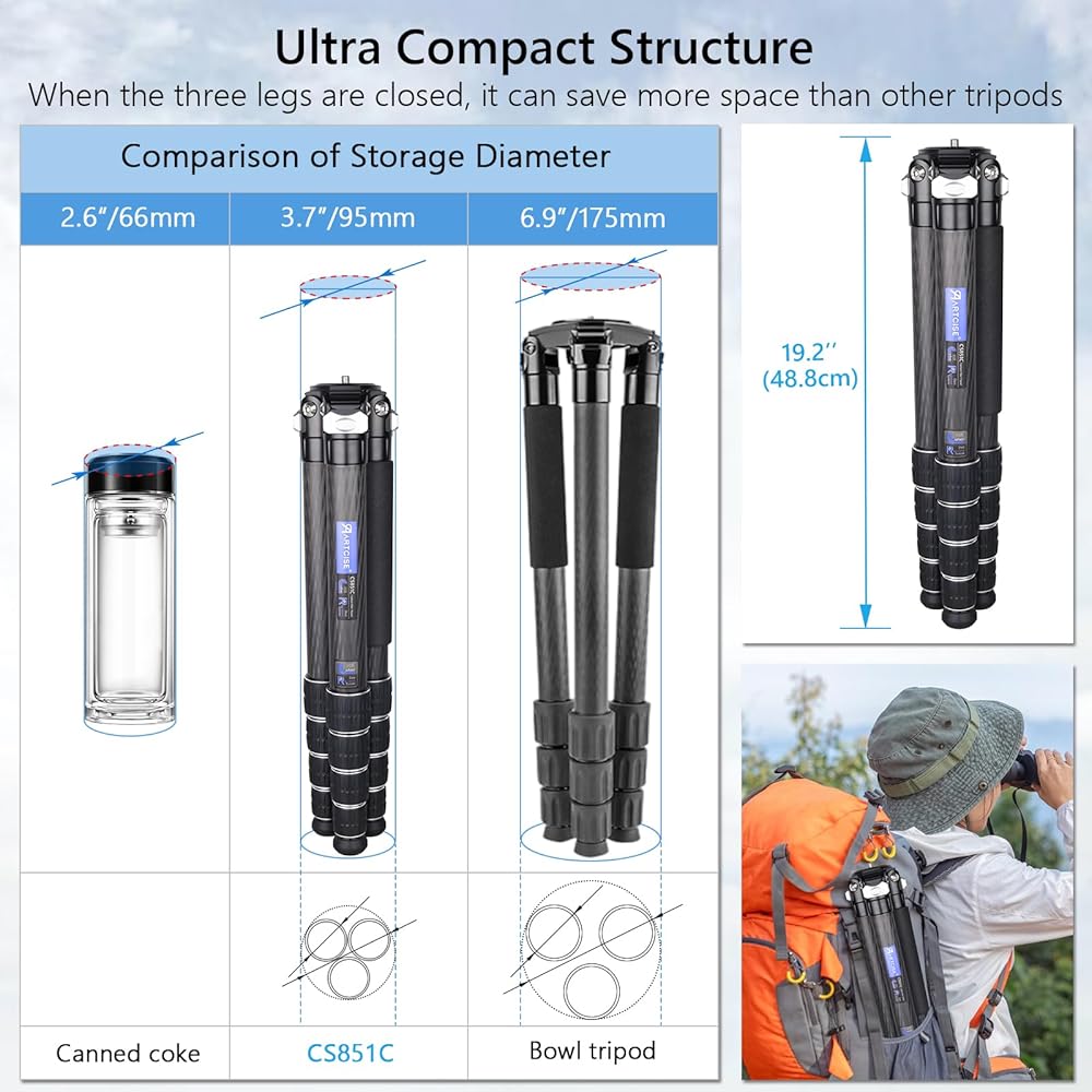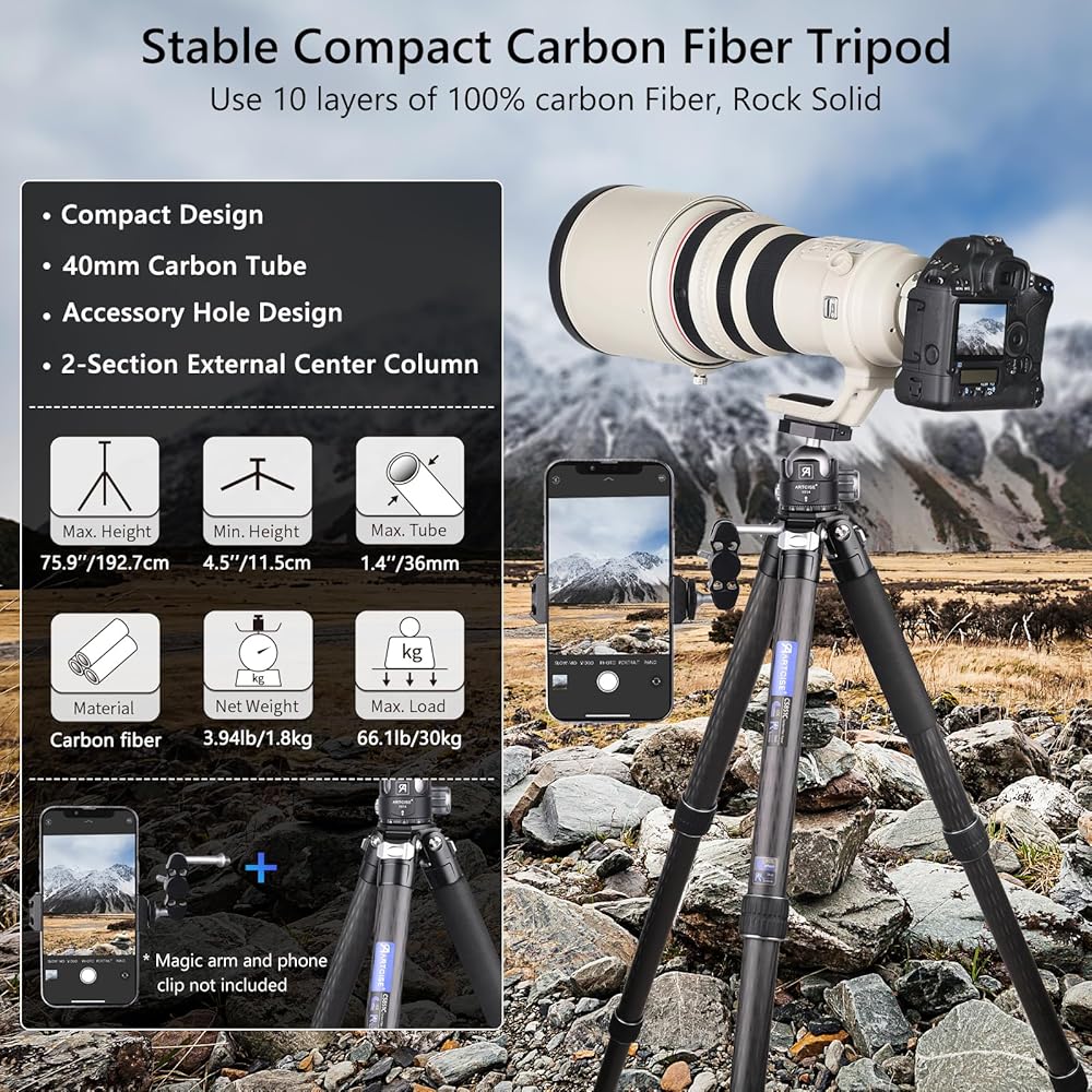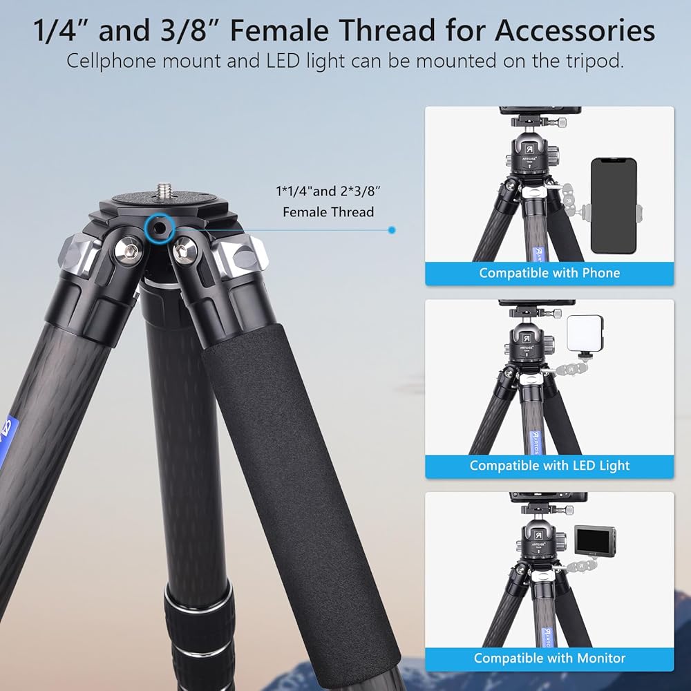 【Compact design heavy-duty carbon tripod】: It features a 36mm-32.5mm-29mm-25.5-22mm tube diameter+ accessory holes design. It is suitable for wild hunting, bird shooting, and wild animal photography.