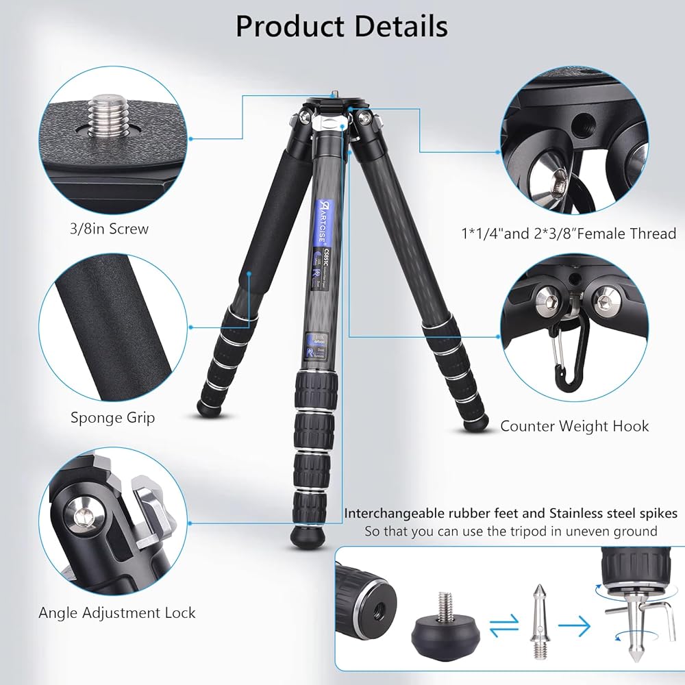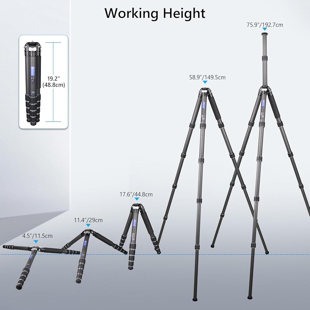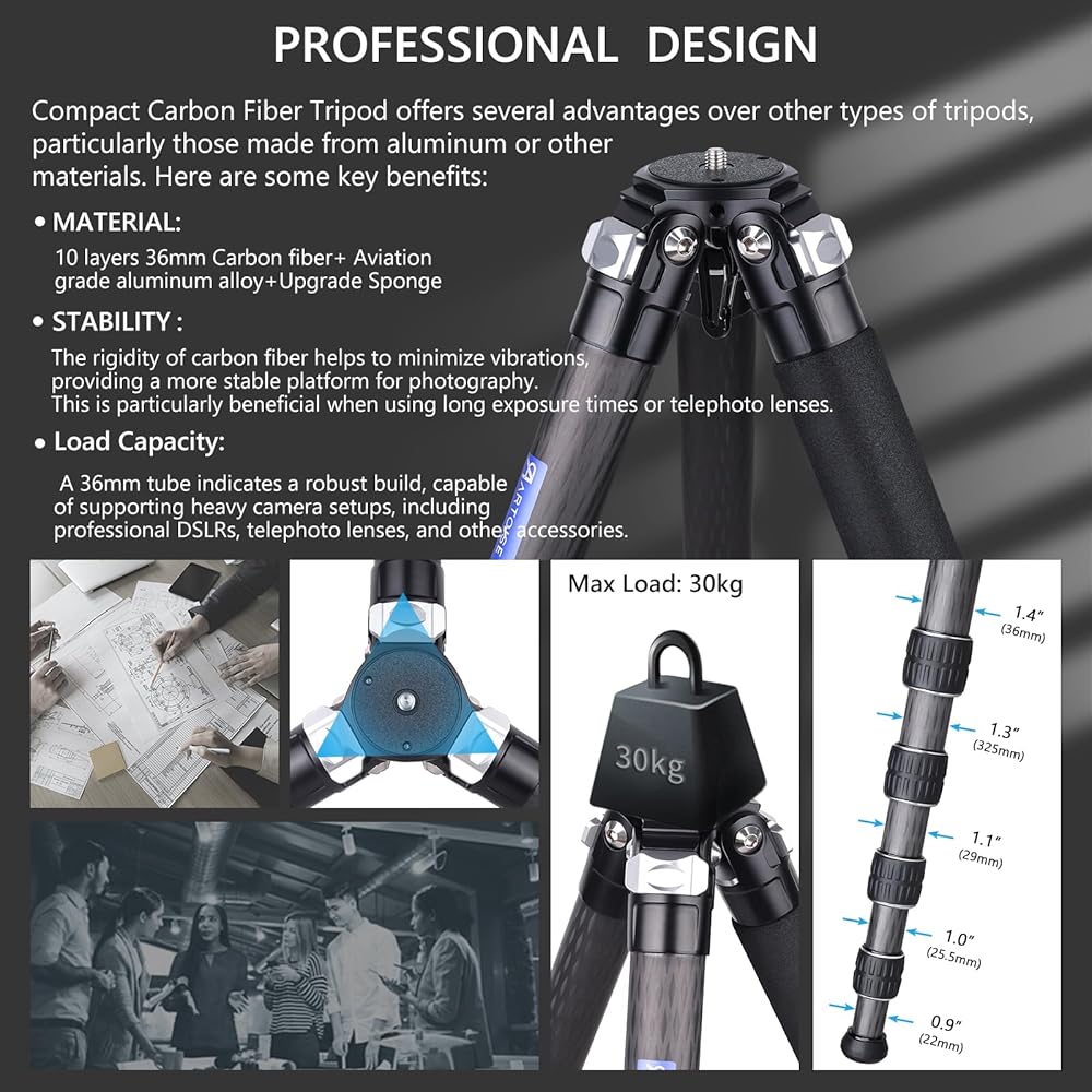 【Stable and Sturdy Carbon Fiber Tripod】 Max 36mm carbon tube and CNC machining main parts provide strong stability and durability. Max Load 30Kg.