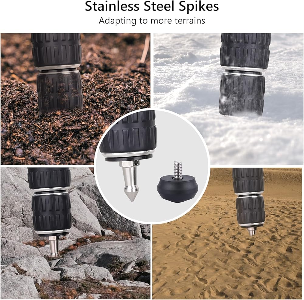 【Multi-angle& Multi-environments Shooting】: Twist Lock can set the position quickly, the adjustable height from 11.5cm to 192.7cm which can satisfy most needs. legs are covered with a sponge grip, protecting hands when used in a cold environment, and equipped with interchangeable rubber feet and stainless steel spikes so you can use the tripod on uneven ground.