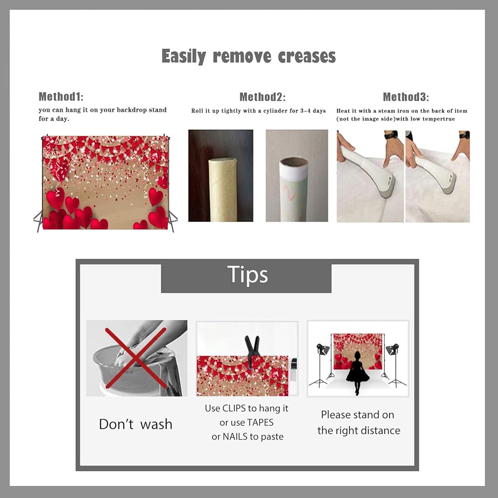 :) [Remove creases] : First,use wet cloth wipe or Low temperature ironing backdrop back. Second,roll up backdrop with a stick and put it for a few days.