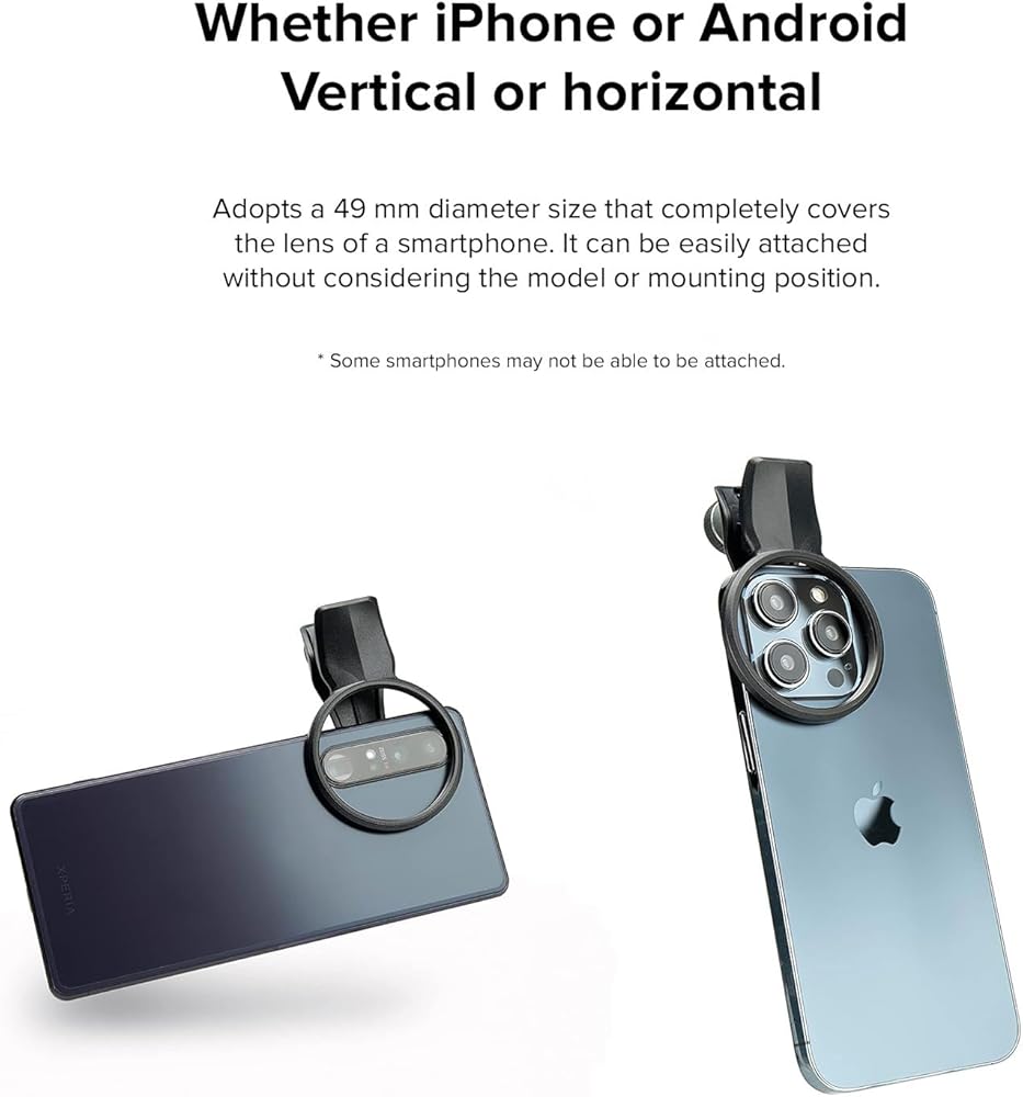 • Filter clip outer dimensions: 84 x 56 x 37mm / Filter diameter: φ49mm / Compatible smartphone thickness: 5-15mm / Included: x1 Filter Clip, x1 Lens filter