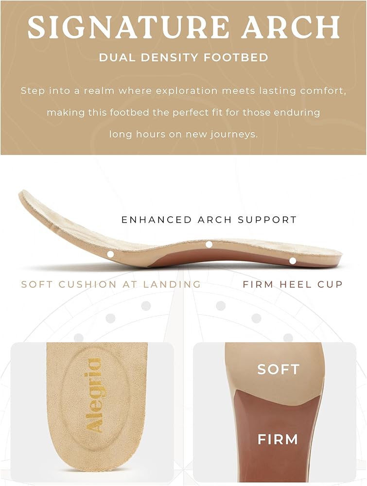 ARCH SUPPORT. Features Alegria Signature Arch technology - a dual density footbed with soft cushioning at the ball of feet to reduce pressure, arch support for balanced weight distribution and firm heel cup to counter against fatigue at the heel.