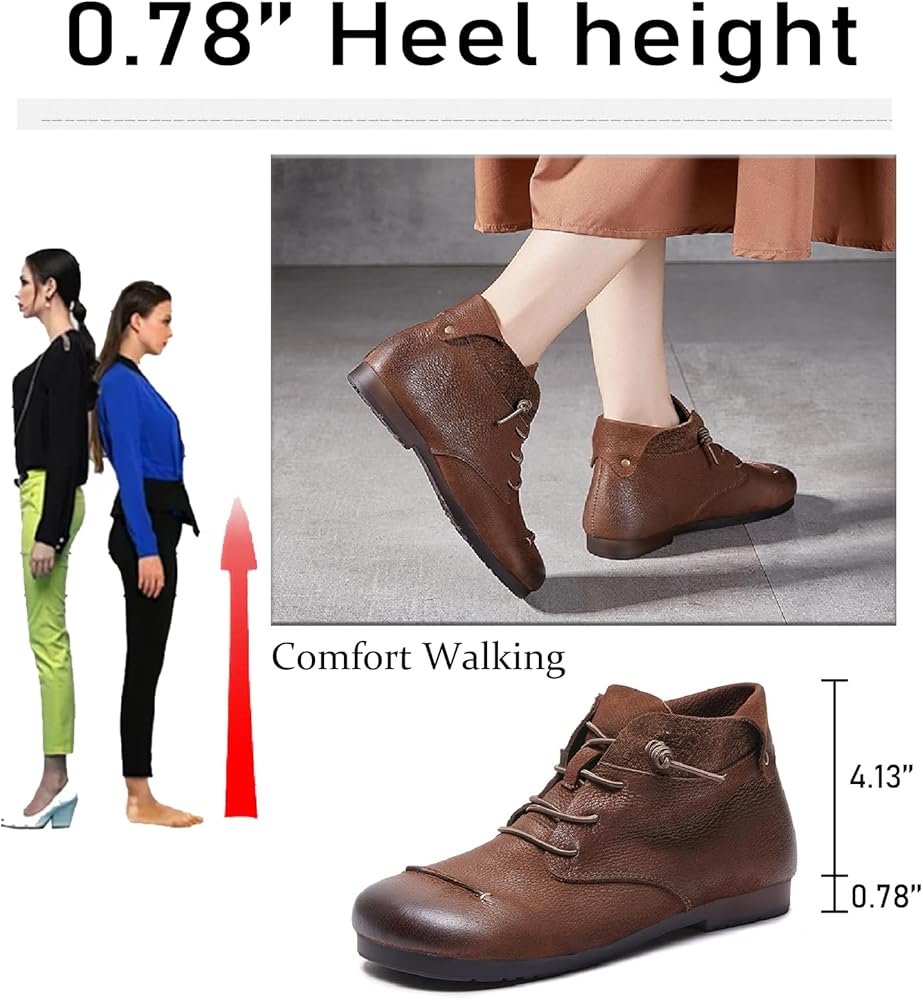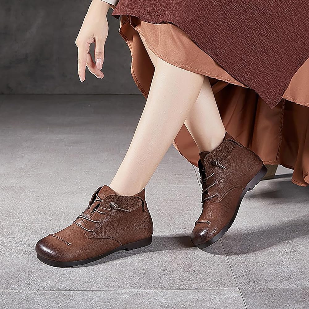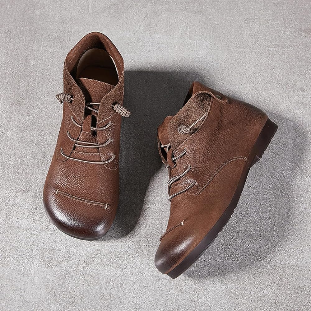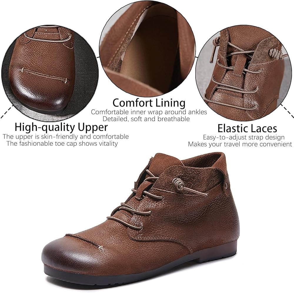 • 【Retro design】: Women's genuine leather short boots adopt a round toe, the round space can easily release your toes, the hand-brushed cowhide upper, the old retro style, the classic will never go out of style. Convenient elastic lace-up design, easy to put on and take off, firm your legs, and let you walk without worries.