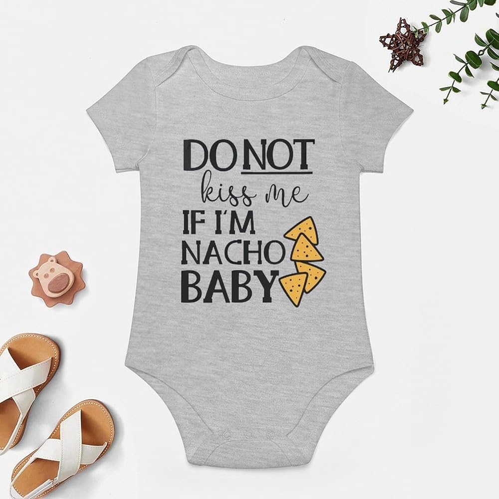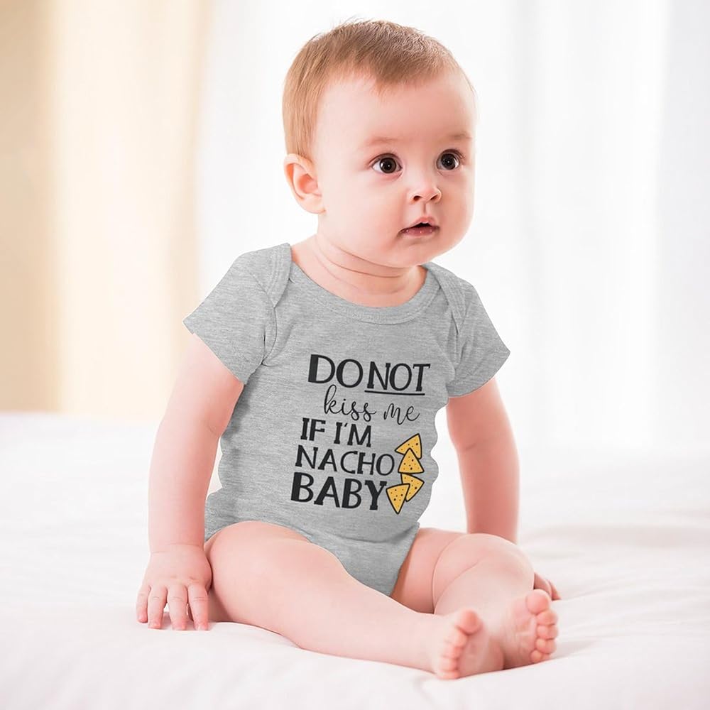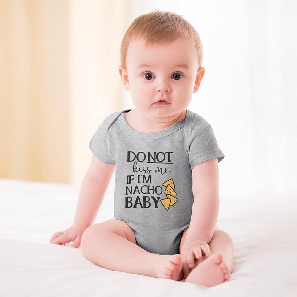 The Do Not Kiss Me If I'm Nacho Baby onesie for newborns, infants, and toddlers features a witty and unique front design that is sure to give you and other adults a chuckle. As each baby onesie is made with only the finest, high-quality materials, your baby is sure to be at their comfiest, and they will not fall apart after a few wash cycles. On top of this, our bodysuits are environmentally friendly. We only use eco-friendly ink and they each come pre-washed in chemical-free, sensitive to skin detergent for your baby's safety.