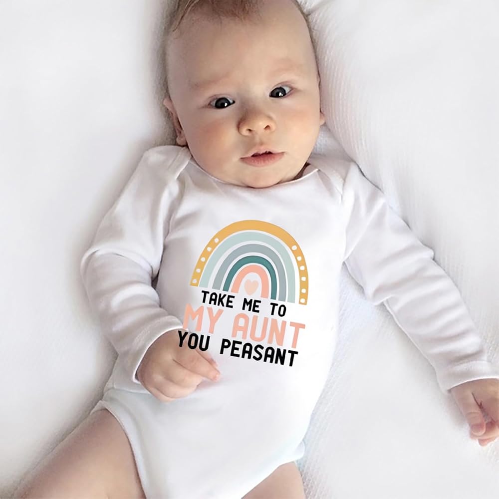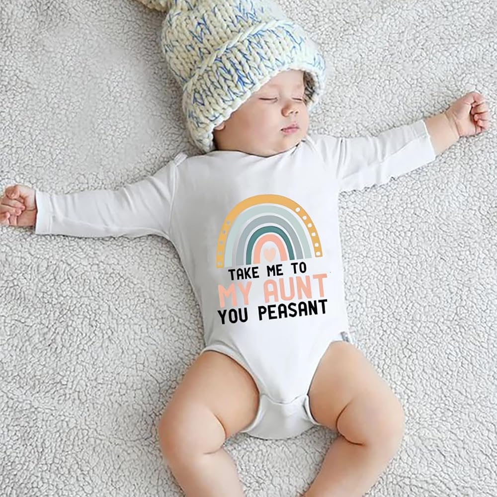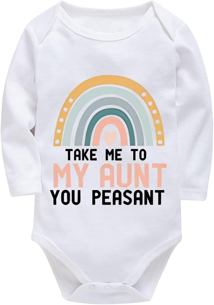 The Take Me To My Aunt You Peasant onesie for newborns, infants, and toddlers features a witty and unique front design that is sure to give you and other adults a chuckle. As each baby onesie is made with only the finest, high-quality materials, your baby is sure to be at their comfiest, and they will not fall apart after a few wash cycles. On top of this, our bodysuits are environmentally friendly. We only use eco-friendly ink and they each come pre-washed in chemical-free, sensitive to skin detergent for your baby's safety.