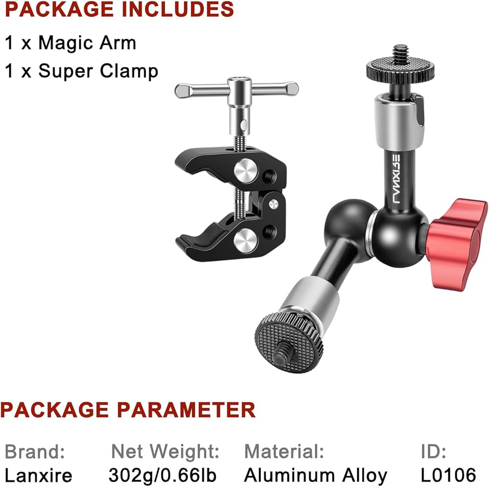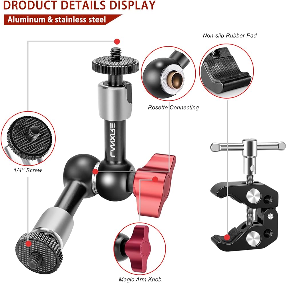 【360 درجة الزاوية الواسعة الزاوية】 الذراع السحري لديه رؤوس كرة مزدوجة 360 درجة تعبر عن desgin. يمكنه ضبط أي زوايا بناءً على احتياجاتك ، مما يوفر مجموعة واسعة من زوايا التصوير. يتميز هذا الذراع السحري بقفل الضوابط لإطلاق التوتر أو زيادة التوتر. من السهل الاستخدام مع مقبض واحد لقفل الذراع في جميع المواضع.