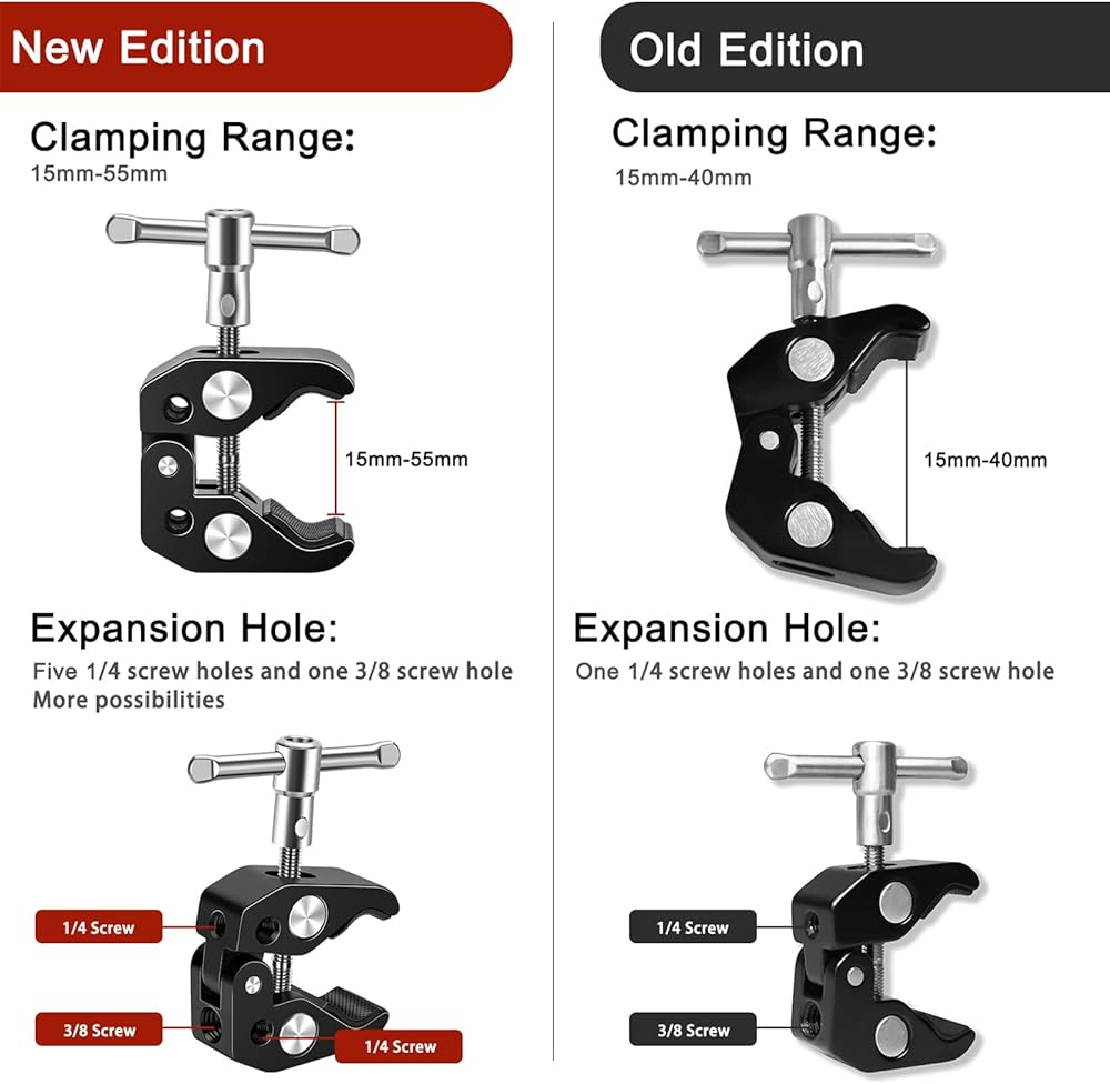 【Super Clamp】 يأتي مشبك الكاميرا الفائق مع فتحات الخيط القياسية 5 × 1/4 "و 3/8" لتكوين مختلف. يمكن تركيبها فعليًا في أي مكان ، يمكن أن تتسع على أي جسم على شكل مثل الكاميرات والأضواء والدراجات والمظلات والرفاف والأرفف والزجاج الصفيح والبارز المتقاطع ، إلخ.