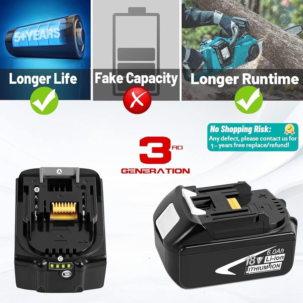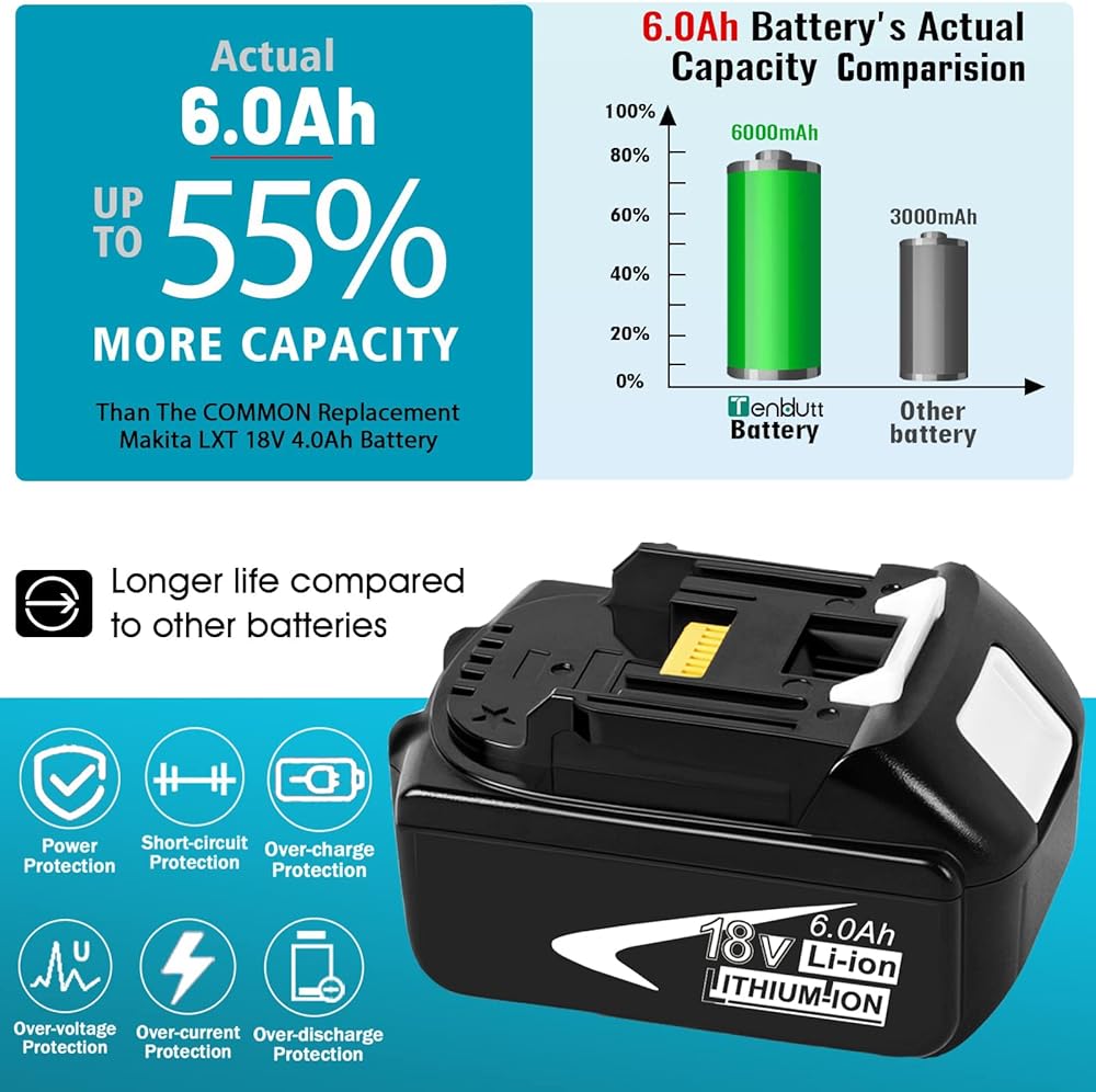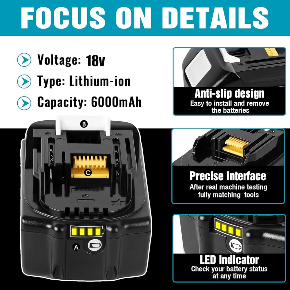 [المواصفات الأساسية]: نوع البطارية: ليثيوم أيون | الجهد: 18V | السعة: 6000mAh | إخراج الطاقة: 108WH | الوزن: 605 جم/لكل | تصميم قابل للشحن وقابل للفصل | مزود بمؤشر LED الذكي | متوافق مع استبدال OEM.