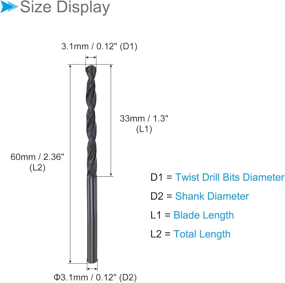 • ★ Drill Bit set Size --- 10Pcs 3.1mm / 0.12-inch dia metric twist drill bit with 33mm / 1.3-inch blade length, and total length is 60mm / 2.36-inch.