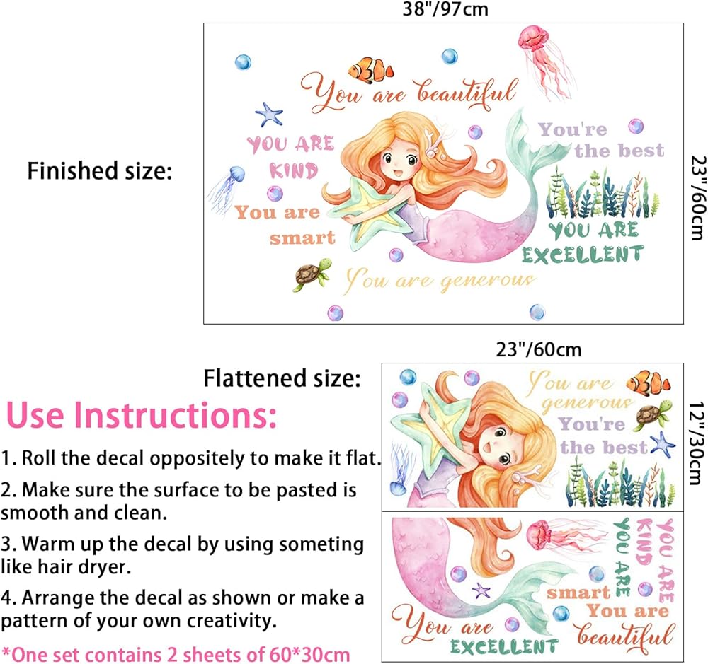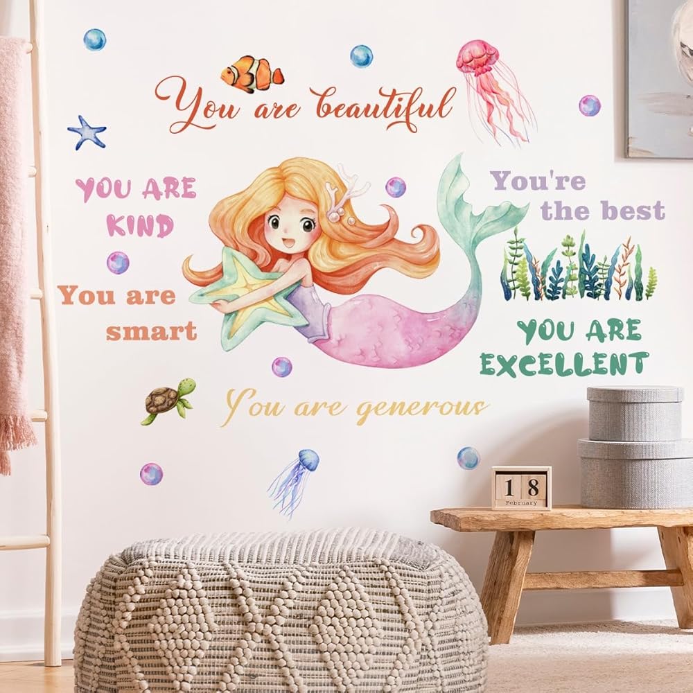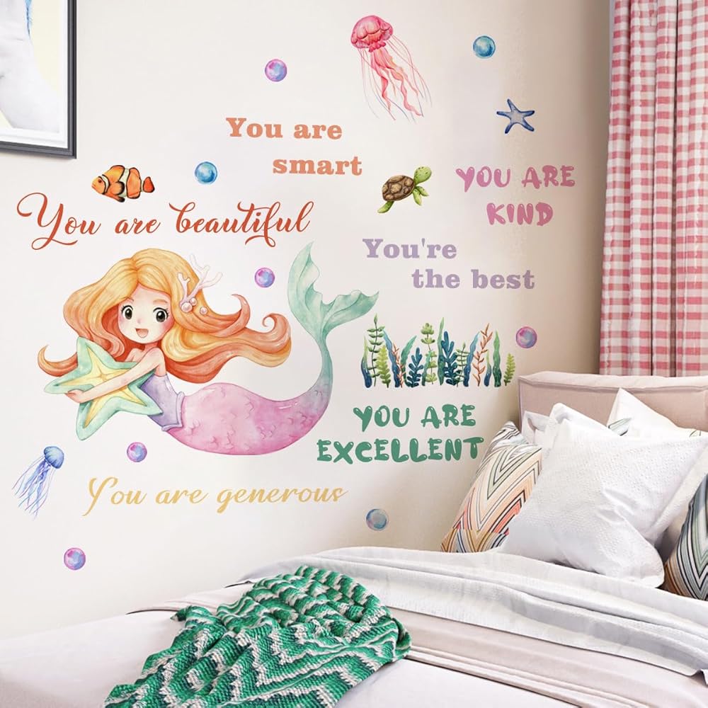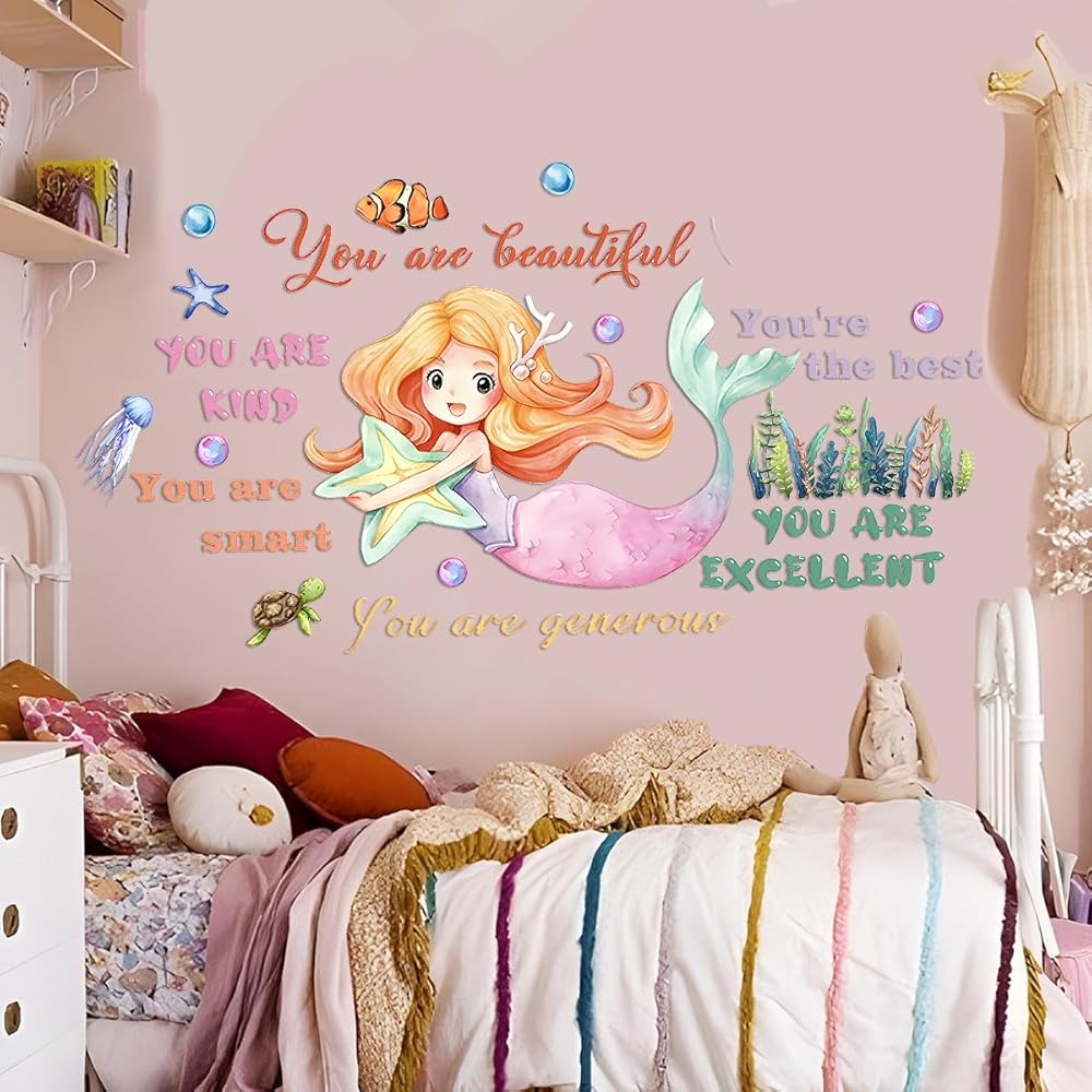 Mermaid Wall Sticker Decor for Girls Room, Large Wall Decal Stickers, Inspirational Wall Decor for Home, Kids Bedroom, Living Room