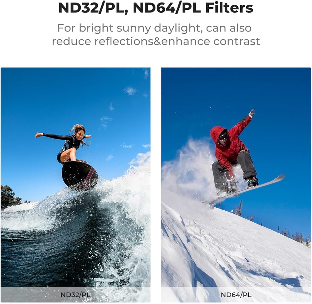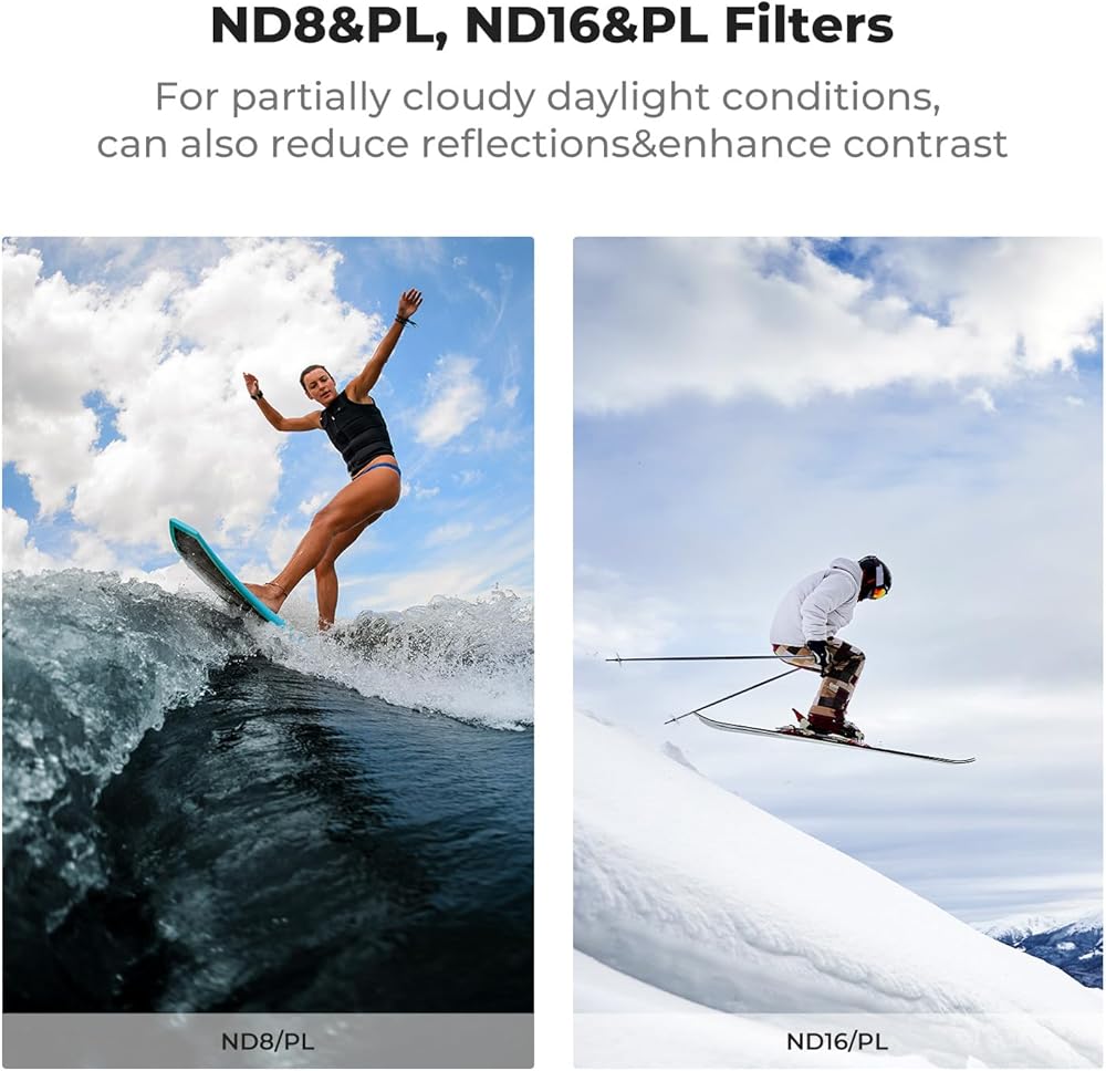 متوافق مع DJI Osmo Action 5 Pro/Action 4: تم تصميم مجموعة مرشحات ND/PL الأخيرة من مفهوم K&F خصيصًا لـ DJI Osmo Action 5 Pro و Osmo Action 4 ، مناسبة لالتقاط الرياضة عند الظهر أو في سيناريوهات ضوء النهار المشرق مثل حقول الثلج. تعمل سرعة الغالق المنخفضة والانعكاسات على تعزيز طمس الحركة وتأثير بصري أكثر لافتة للنظر.