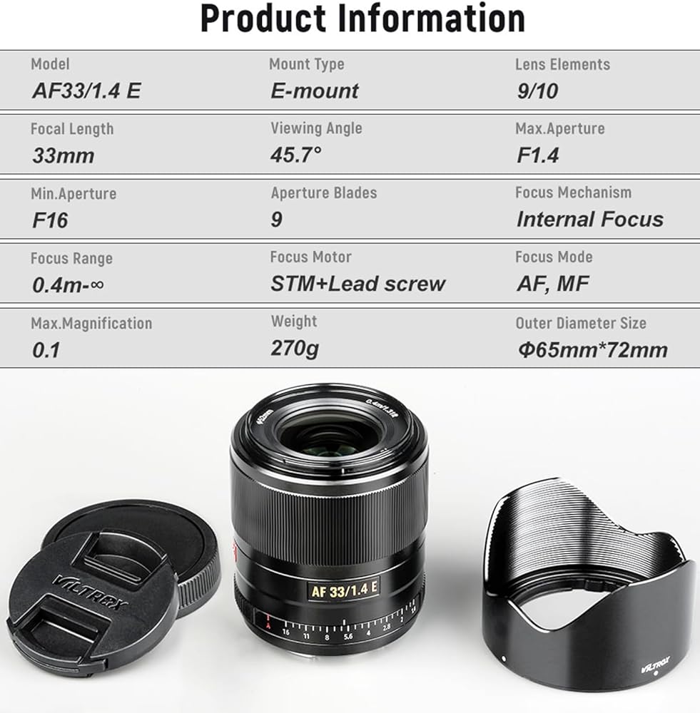 Prime Aperture Prime: تتميز العدسة Filtrox 33mm F/1.4 بفتحة أقصى كبيرة ، مما يتيح أداءً ممتازًا في الإضاءة المنخفضة والقدرة على إنشاء عمق ضحل من الحقل مع تأثيرات خوخه جميلة.