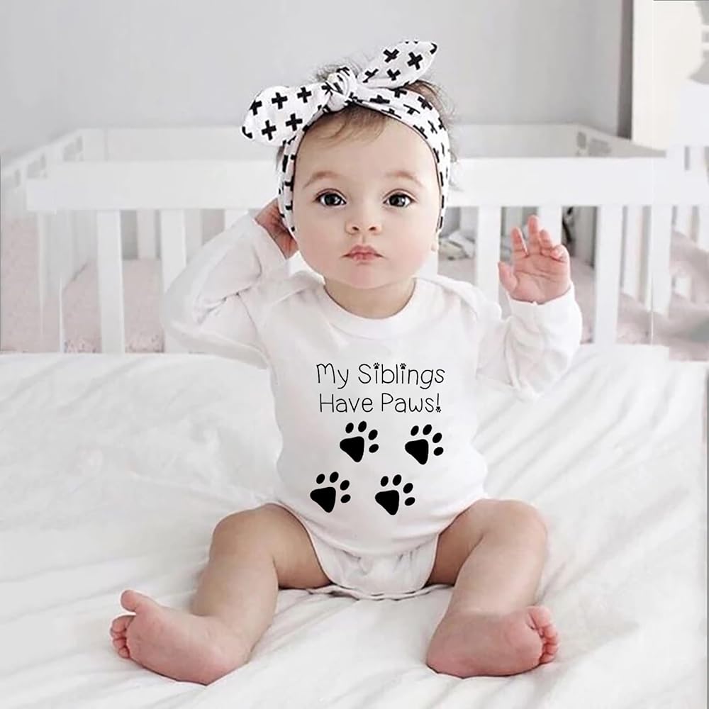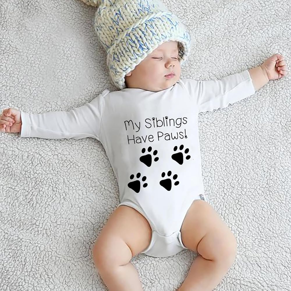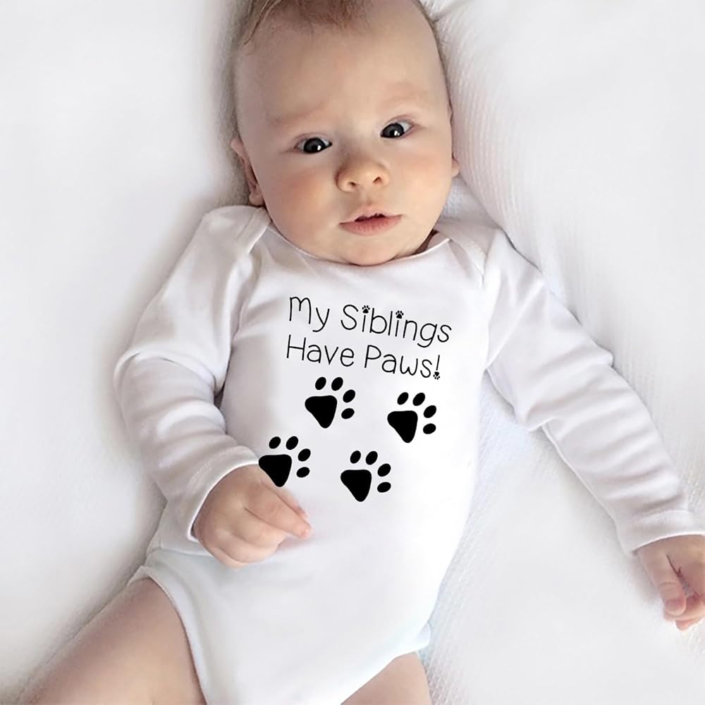 The My Siblings Have Paws onesie for newborns, infants, and toddlers features a witty and unique front design that is sure to give you and other adults a chuckle. As each baby onesie is made with only the finest, high-quality materials, your baby is sure to be at their comfiest, and they will not fall apart after a few wash cycles. On top of this, our bodysuits are environmentally friendly. We only use eco-friendly ink and they each come pre-washed in chemical-free, sensitive to skin detergent for your baby's safety.