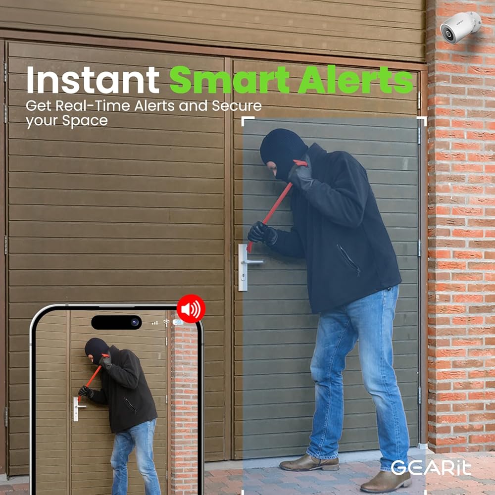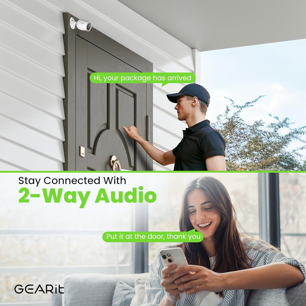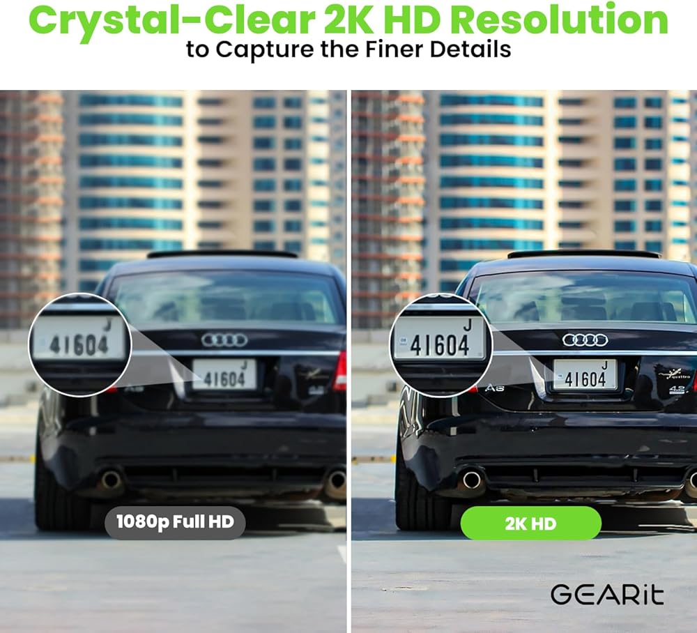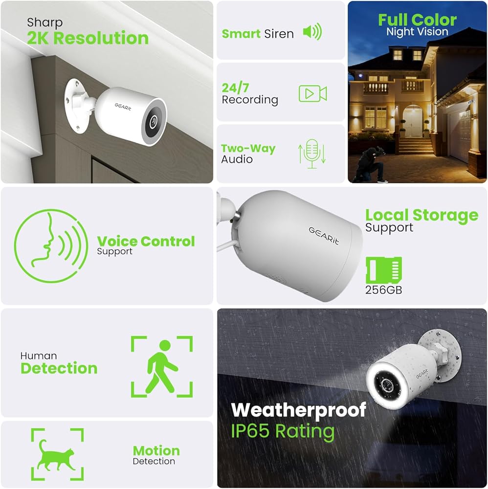 Vivid 2K HD Video with Full-Color Night Vision: Enjoy crystal-clear video with GEARitÕs outdoor security camera. With integrated infrared and eight white LED lights, it captures sharp images day and night, providing full-color footage even in total darkness.