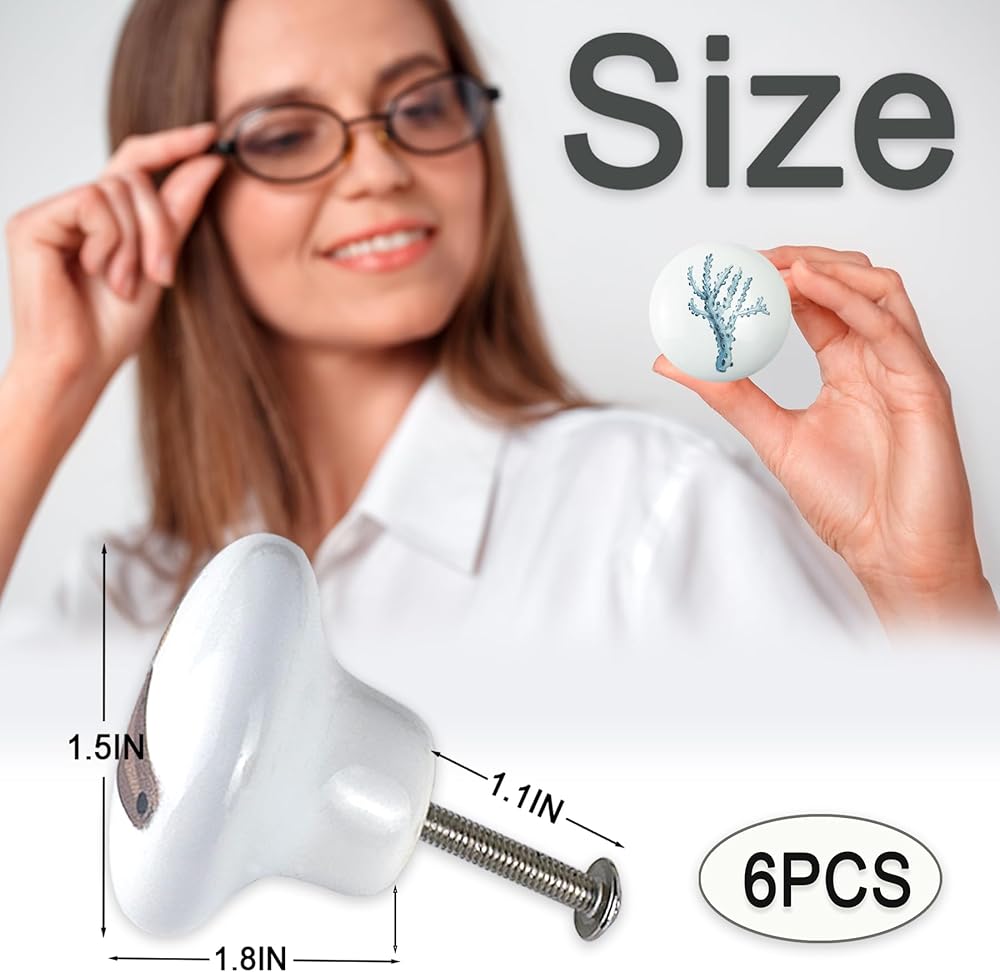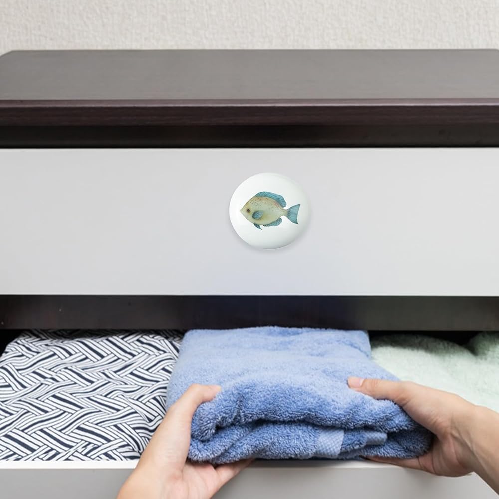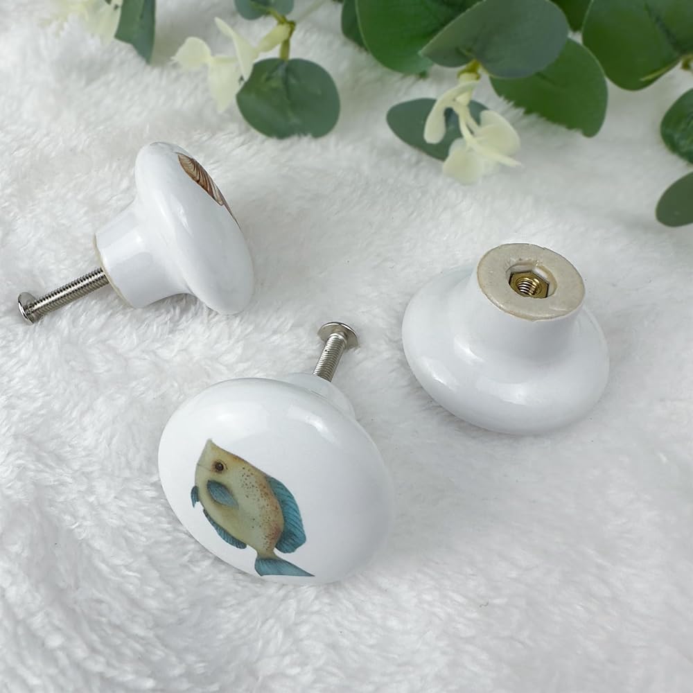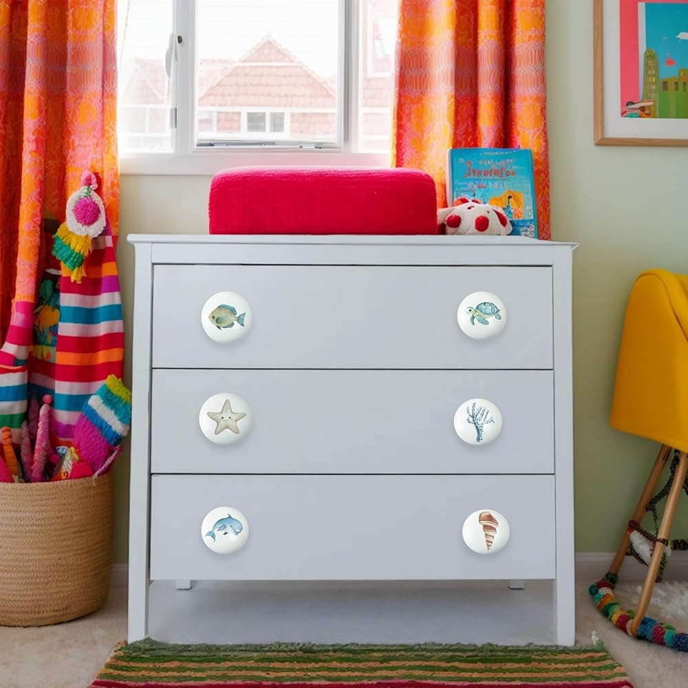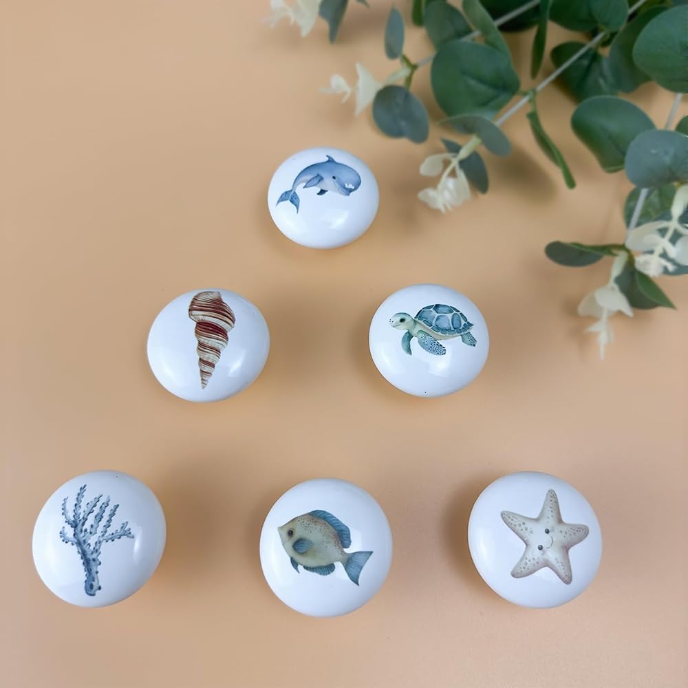 Installing these knobs is simple and hassle-free. Just drill a hole where you need the knob, insert the screw from the back of the surface, and tighten it onto the knob. No complicated instructions or tools required—it's quick and easy, perfect for DIY projects or furniture upgrades.Crafted from high-quality ceramic, these knobs are built to last. They're designed to stay securely in place, with vibrant patterns that resist fading and scratching, even with regular use. Your furniture will stay looking fresh and stylish, making these knobs a long-lasting addition to any room.These knobs feature 6 different colorful designs inspired by ocean themes, adding a fun and unique touch to your space. The playful and cute elements bring a sense of warmth and personality to any room, making them especially great for children's rooms, nurseries, or any space that needs a cozy, personalized feel.