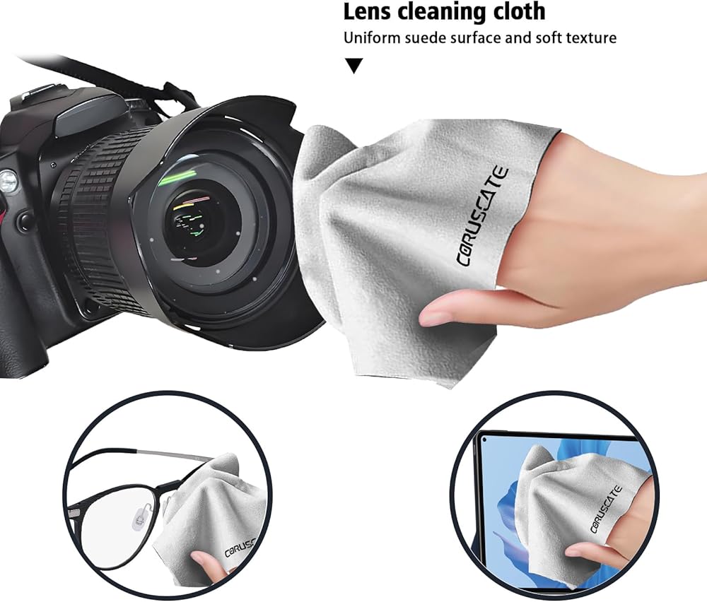• 【6】Lens Cleaning Cloth:Size 5.7"*7",The super soft Pure suede cloth that is evenly and tightly distributed on the lens cloth.Sucks and removes dust,oil,stains,fingerprints and dirt quickly and easily.Pure suede cloth is more absorbent.Can be used with cleaning solution to wipe the lens cleaner without leaving water stains(Both sides are suede,so it is thicker than normal glasses clean cloth)