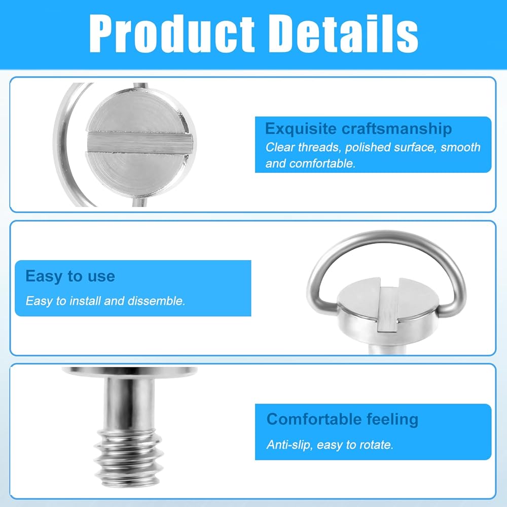 Product Details: The 1/4" camera tripod screws have clear threads and polished surface, smooth and comfortable. Easy to install and dissemble. Anti-slip, easy to rotate, can bring you a pleasant use experience.