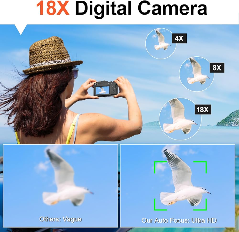 【18X digital zoom】The 18X digital zoom of the compact camera allows you to zoom closer to the subject while taking photos or videos to capture smaller details.
