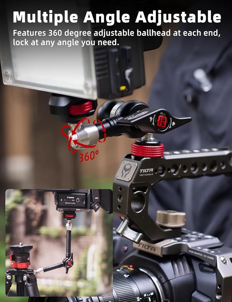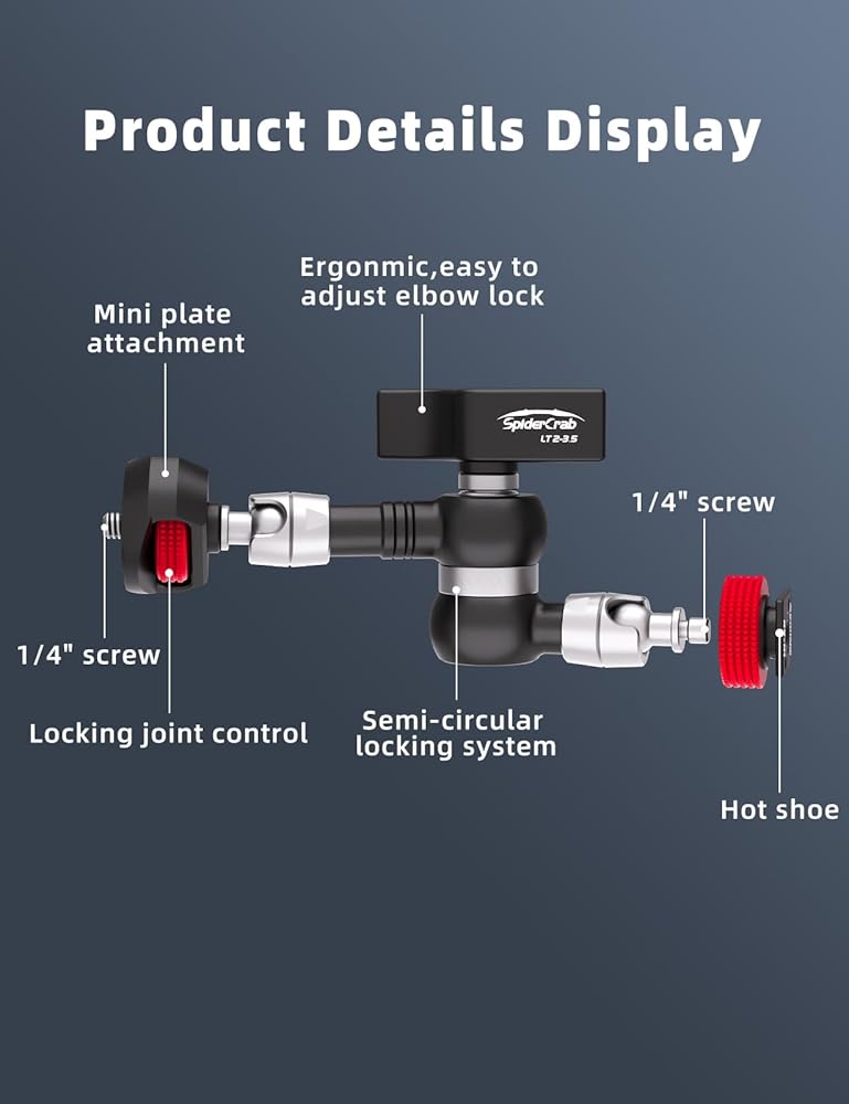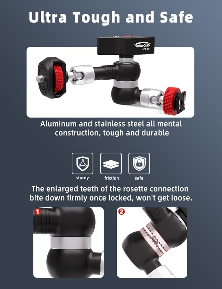 The 1/4"-20 mounting end features an oversized thumbwheel with an embossed pattern for better grip. Both ends of the arm move freely and independently until you lock the arm. Anti-slip gears in the center hub hold the arm in the position you set when tightening the central locking lever, which also locks the ends in position.