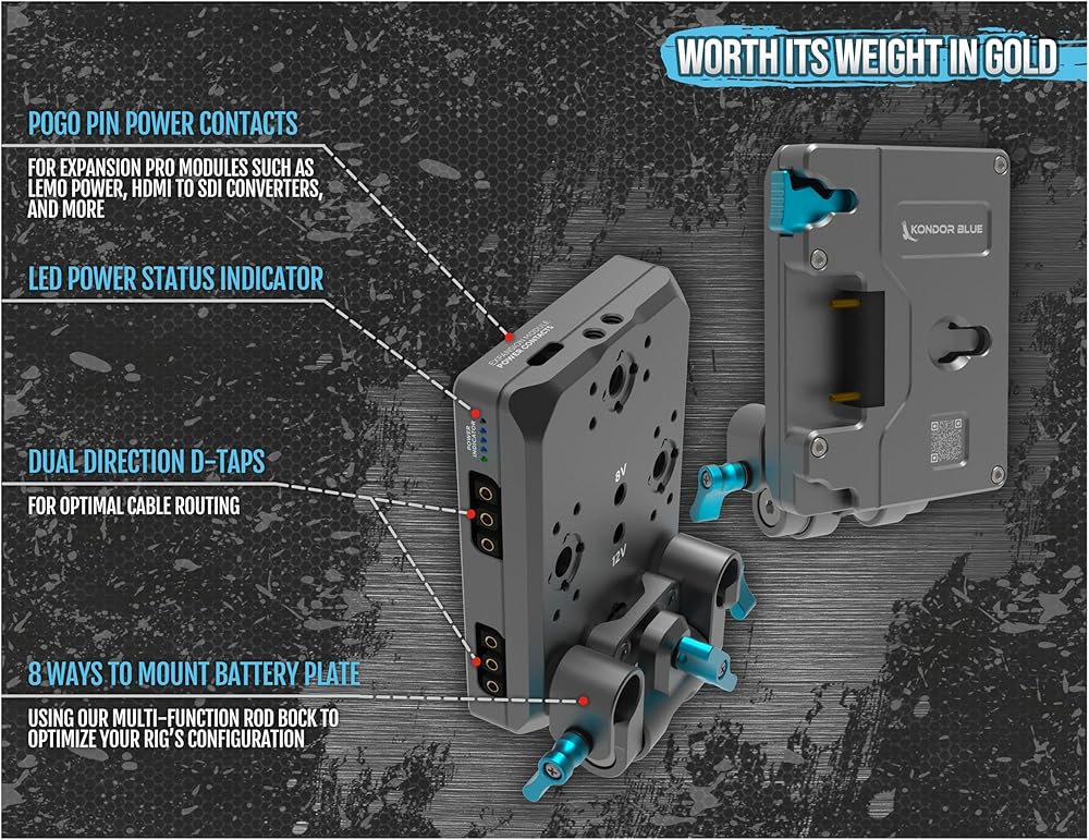 The KONDOR BLUE Gold-Mount Pro Battery Plate offers a long list of features to fit the Pro name. Loaded with a range of power output ports, the plate also features a USB-C PD port which is capable of power output/input. Magnetic power contacts are on the top side of the plate for KONDOR BLUE's Expansion Modules. The body of the Gold-Mount Pro Battery Plate is fully machined out of aluminum. The back of the plate features 4x ARRI-style anti-twist mounts with additional M4 mounts to connect the Battery Plate Rod Block which can be mounted in 8 different positions to best suit your rigging requirements. The Gold-Mount Pro Battery Plate has been scaled down to be able to be better proportionally for the micro-sized batteries that have become increasingly popular. The Pro Battery Plate is backed by the KONDOR BLUE's exceptional lifetime warranty and customer support.