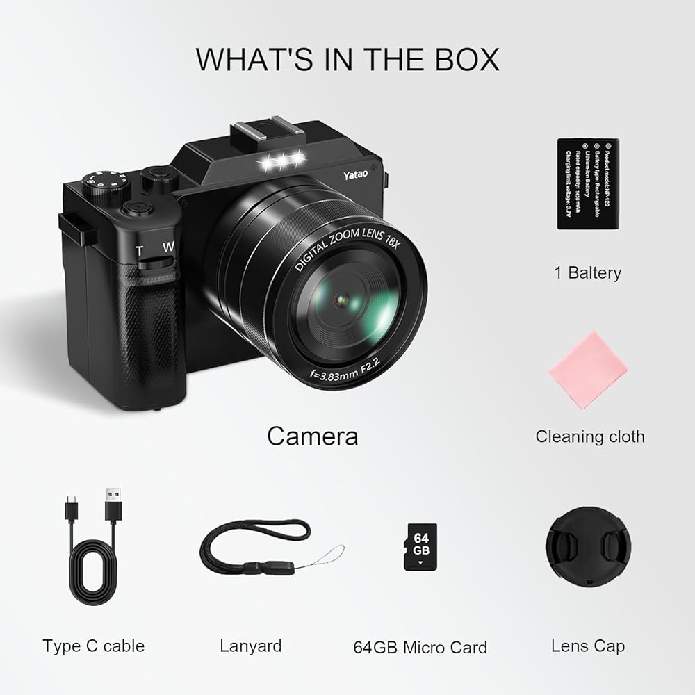 Yatao Digital Camera مع WiFi ، و 64 ميجا بايت التصوير الفوتوغرافي ومجموعة 4K 5K Vlogging Camera Tit For YouTube ، والكاميرا المزدوجة الأمامية والخلفية لصورة شخصية مريحة ، مجهزة ببطاقة صغيرة 64 جيجابايت