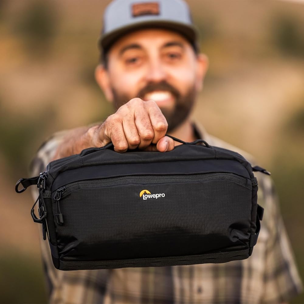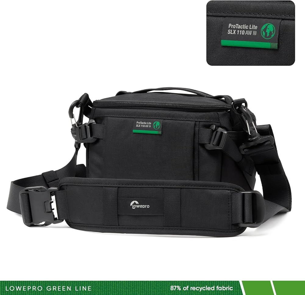 Adapt to Every Moment. The ProTactic Lite SLX 110 AW III, part of Lowepro's ProTactic III collection, is a versatile sling or shoulder bag designed for photographers. This bag fits a full-frame mirrorless camera with a 24-70 f2.8 attached and includes dividers for smaller lenses and other gear. It can be used as a standalone bag or as an insert in the ProTactic Lite backpacks.Innovative Access and Organization. The ProTactic Lite SLX 110 AW III features a fully molded divider system with MaxFit dividers, ensuring optimal use of space. The bag includes stretch pockets on both sides for lens caps or the included All Weather Cover (AWC), a soft volume front pocket with a key leash and organizer pockets, and a zippered pocket on the door. The back wall has a flat padded pocket for additional organization.Comfort and Durability. The ProTactic Lite SLX 110 AW III comes with an adjustable shoulder strap that allows for comfortable carry as a shoulder bag or crossbody sling. The strap includes a buckle with a safety to prevent accidental release and elastic loops to contain excess strap length. The bag can also be carried as a waistpack by adding the ProTactic Utility Belt III or the belt from the ProTactic BP 350 III or 450 III.Sustainability and Longevity. Committed to reducing our impact on the environment, the ProTactic Lite SLX 120 AW III uses up to 87% recycled fabric* by weight. These materials go through thorough lab and field testing to ensure they meet our performance and durability requirements to make a bag with longevity you can rely on. This bag is designed for longevity with replaceable parts like the accessory straps, ensuring a longer life for more adventures.*Measured following the GRI 301-2 standard, as a percentage of the recycled yarn used, compared to the total weight of yarn.