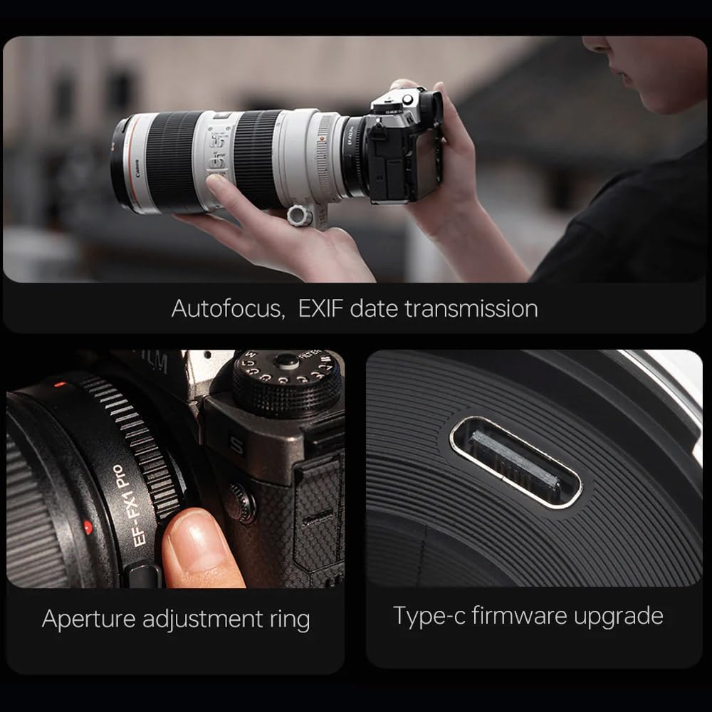 تصميم حلقة الفتحة اليدوية: تم تجهيز حلقة محول العدسة Viltrox EF-FX1 Pro مع حلقة فتحة يدوي ، والتي تشعر بسلاسة ويدعم تعديل الفتحة باستخدام جسم الكاميرا وحلقة الفتحة ، مما يسمح بتعديل سريع وفعال أثناء التصوير