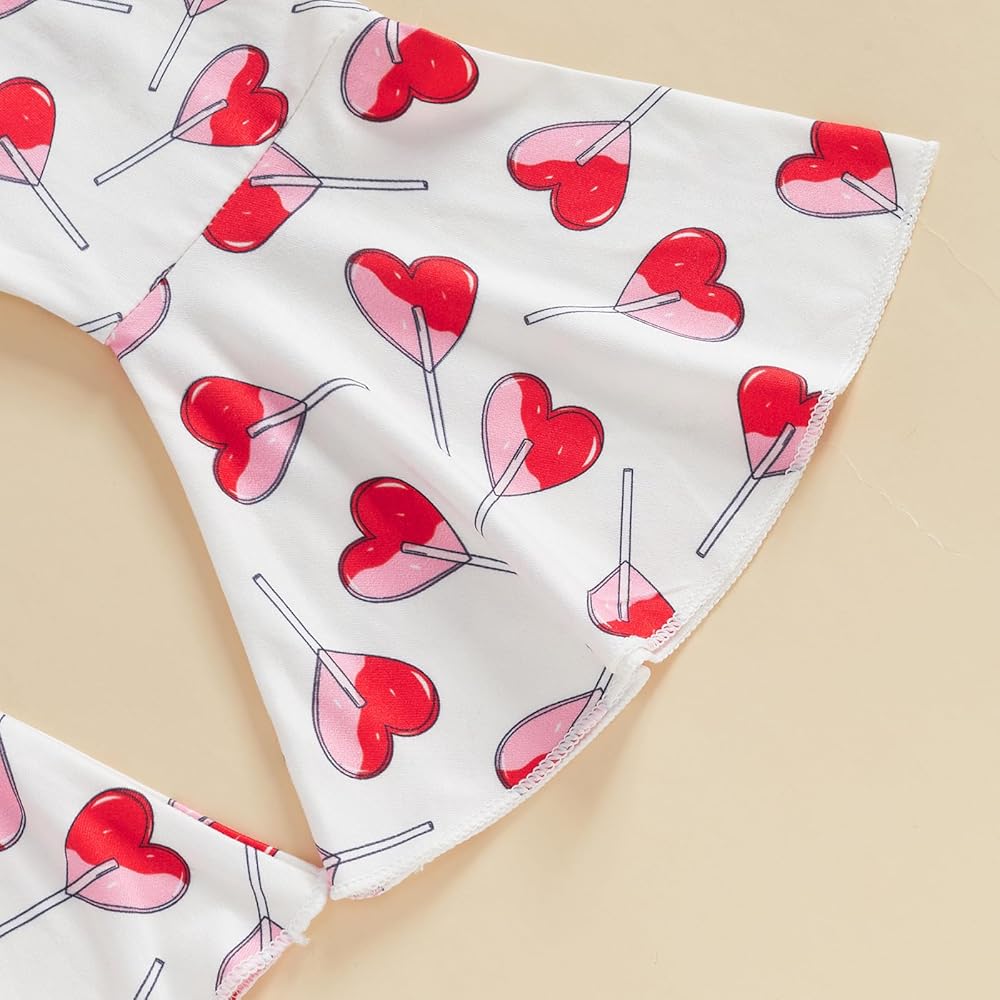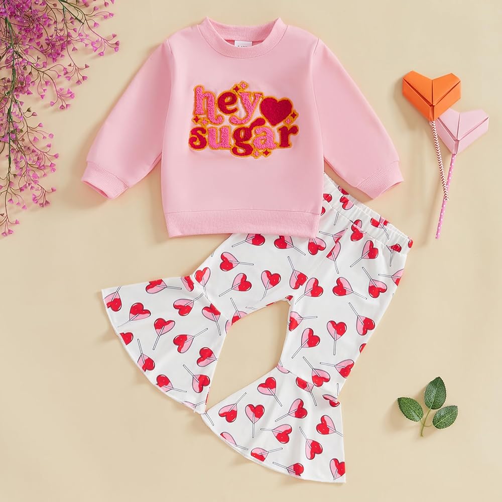 Toddler Girls Valentine's Day Sets Letter Embroidered Ruffled Long Sleeve Sweatshirt Heart Bow Flare Pants 2-Piece Outfits