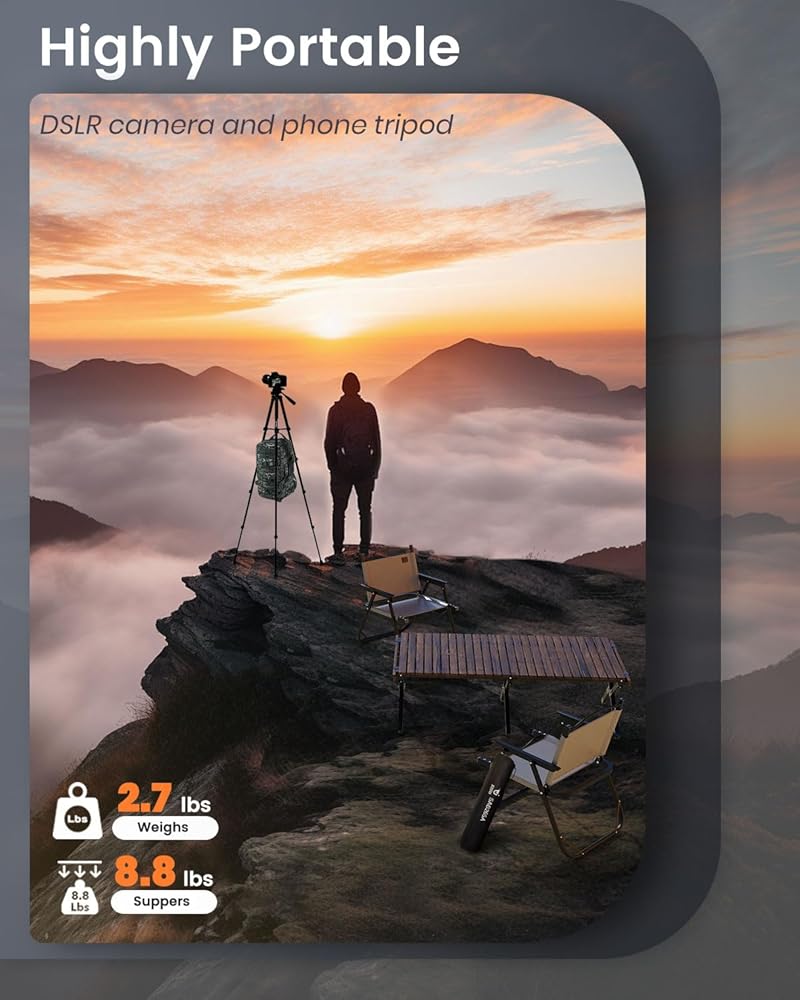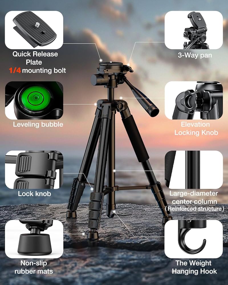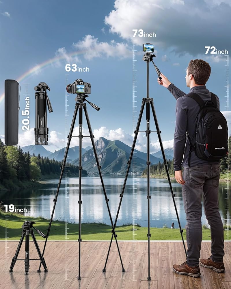 【حامل ثلاثي القوائم خفيفة الوزن بحجم 73 بوصة - يوفر هذا الحامل ثلاثي القوائم خفيفة الوزن ارتفاعات قابلة للتعديل تتراوح بين 19 و 73 بوصة. مزود بمسمار تركيب 1/4 بوصة على لوحة التحرير السريع ، وهو متوافق مع كل من الكاميرات والهواتف الذكية. عند طيها ، فإنه يقيس 20 بوصة فقط ، مما يجعلها محمولة للغاية ومثالية لتغييرات الموقع المتكررة أو السفر. على الرغم من وزنه 2.76 رطلاً فقط ، إلا أنه يمكن أن يدعم حمولة تصل إلى 8.8 جنيه.