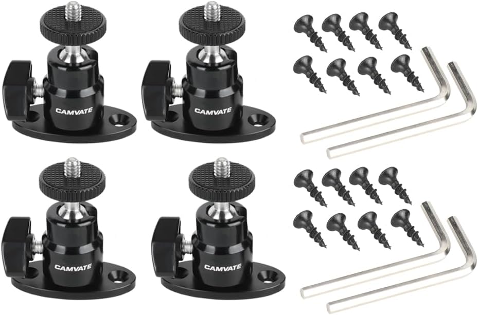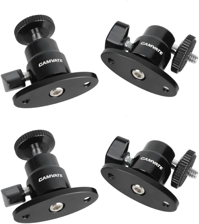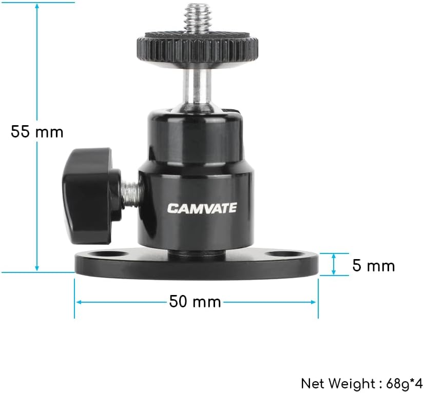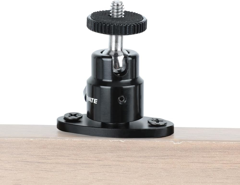The mini ball head mount is made of aluminum alloy for light weight and durability, and could attach a monitor / surveillance system with 1/4"-20 mounting hole to the table, podium, wall and ceiling. It comes with 2 fitting holes on the base that allows sturdily attaching with cross screws. You can also adjust the angel as you want with 360 degree rotating design.
