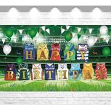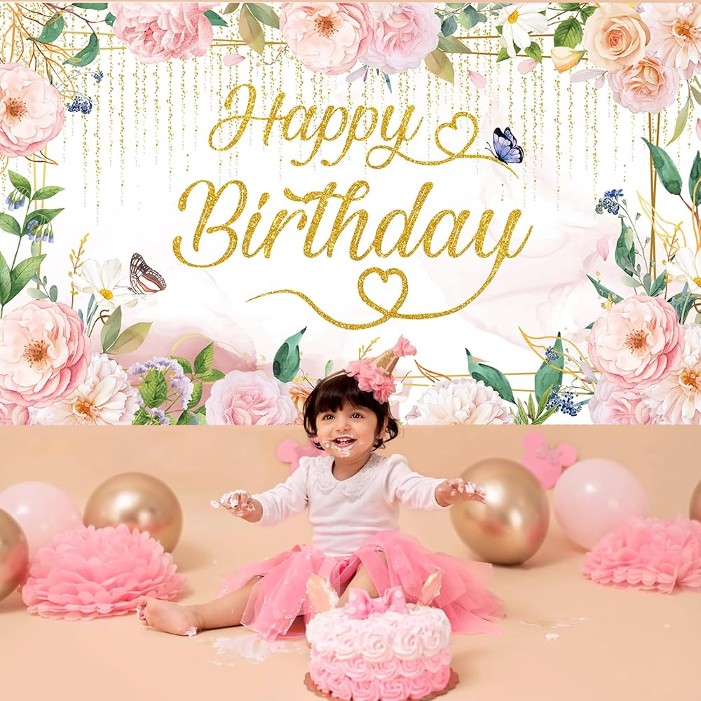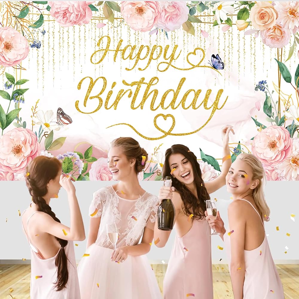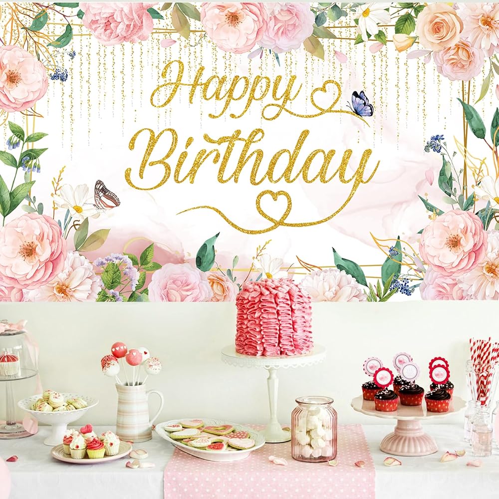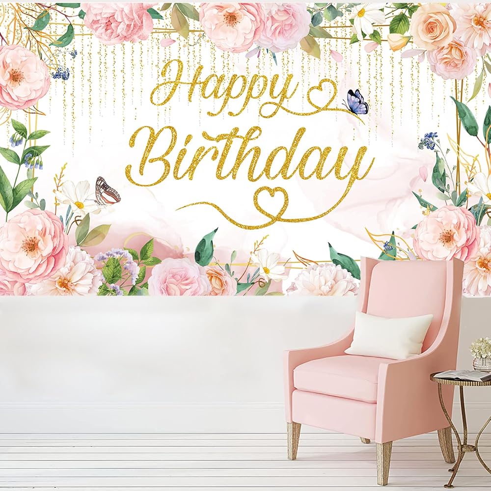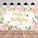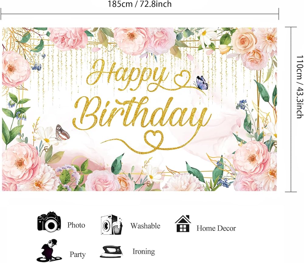 🩷【 تشمل الحزمة】 1pack Green Gold Pink Florals Happy Bridtrop Banner Banner Banner ، الخلفية ، حجم عيد ميلاد الأزهار الحجم: 72.8 × 43.3in (185*110 سم) ، حبل لفة 6 م/19.6 قدم.