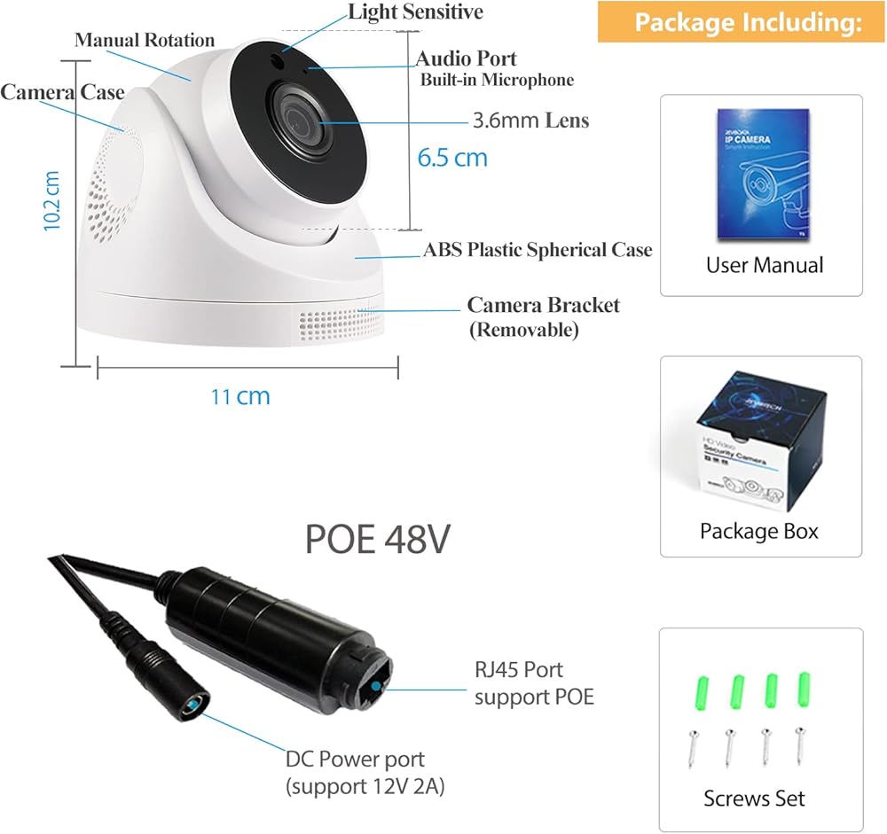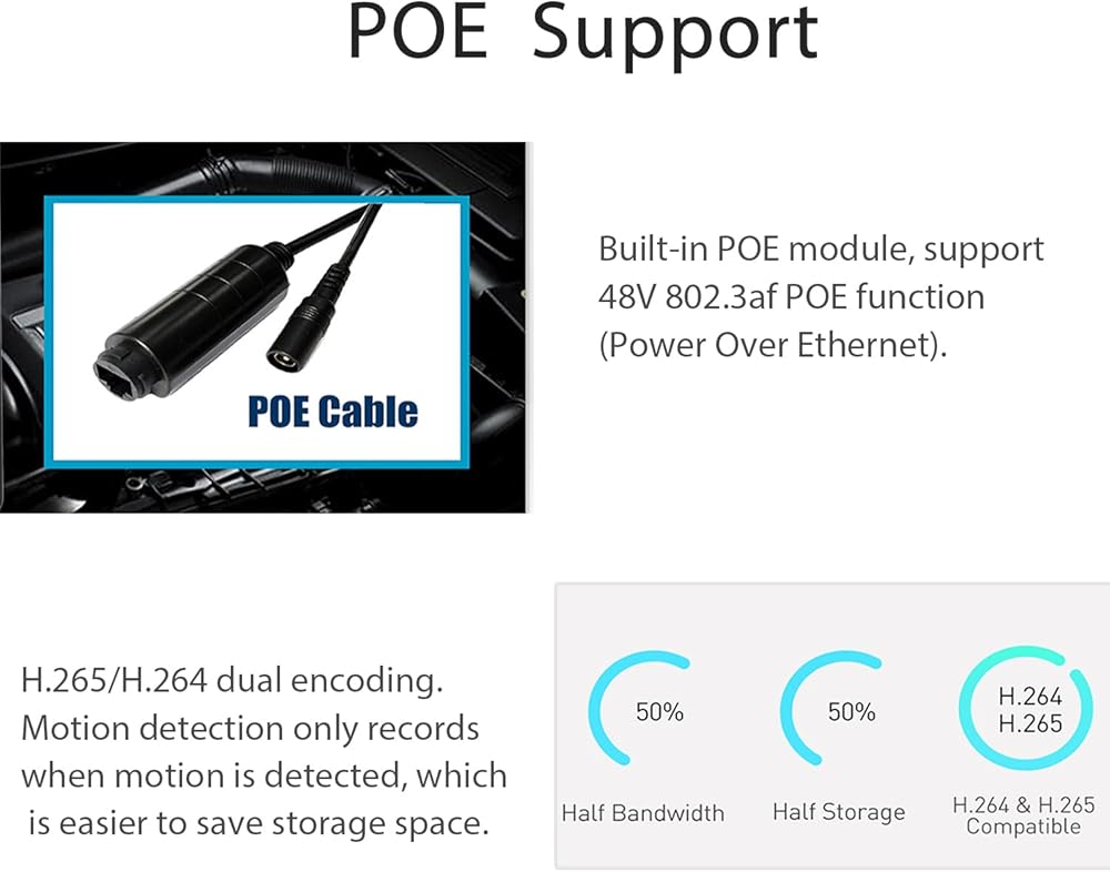 • 〖دعم قالب POE و DC〗 POE المدمج ، دعم وظيفة 48V 802.3AF POE ، (الطاقة على Ethernet) ، تقليل مشكلة الأسلاك. كما أنه يحتوي على واجهة طاقة مساعدة ، والتي يمكن تشغيلها بواسطة مصدر طاقة عادي 12V 2A ويستخدم ككاميرا شبكة غير بوي.