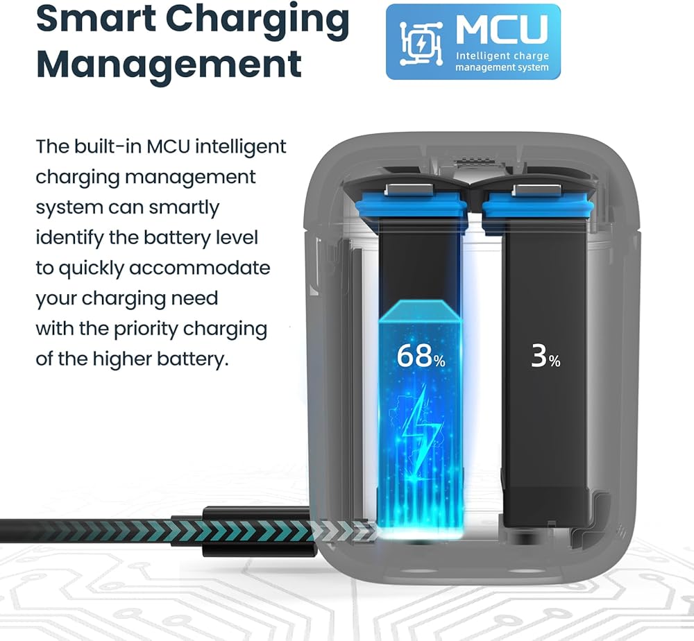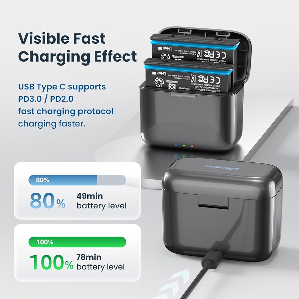 3. 2-in-1 designThe quick charger and storage case are integrated into one unit, which not only charges the camera's battery, but also holds the battery and two SD memory cards. The magnetic flip-top lid is perfect for protecting the battery from vibration and dust during transport. Smart Charging: When the battery reaches 80%, the Smart Trickle Charge mode is activated and starts charging slowly until the battery is fully charged.