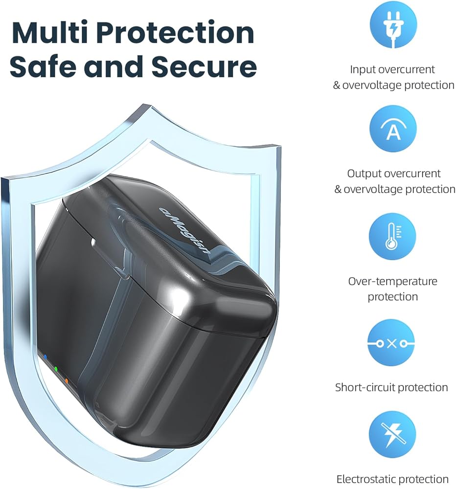 2. Compatible with Type-C port and PD2.0/PD3.0 high-speed power adapter; connects and charges devices with USB-C port; tested with 12V/2A PD3.0 power adapter; charges to 80% in 45 minutes, fully charged in 75 minutes. Automatically stops when charging is complete.