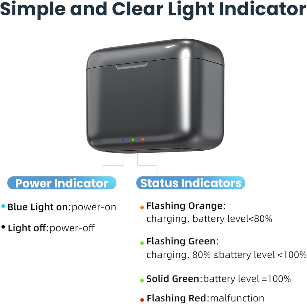 4. LED indicator display allows you to see the charging status at a glance. There are three charging indicators: blue, green, and orange. When the device is turned on, the blue light is lit, and charging is indicated by the green and orange LEDs, respectively. When the orange light is blinking: battery level < 80%, when the green light is blinking: 80% ≤ battery < 100%. Green light