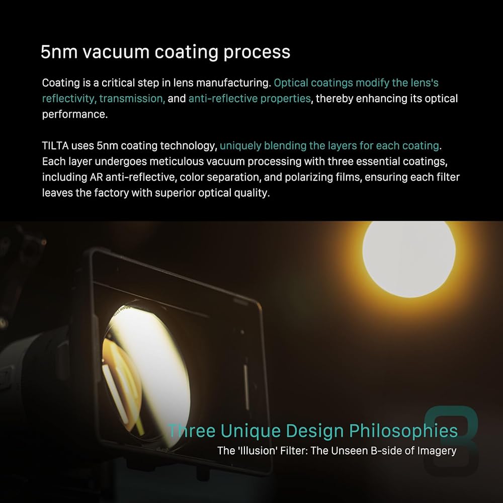 Introducing the next generation of 95mm filters for the Mirage Matte Box – TILTA ILLUSION The Illusion Filters are the new, in house manufactured set of filters specifically designed for the Circular 95mm Standard of the Mirage Matte Box. This filter creates unique, anamorphic inspired flares originating from light sources. The filter can be positioned to create streaks in any direction across the image. This filter produces accurate colors without reducing sharpness and feature a Double Sided Nano Coating which protects the filter from scratches