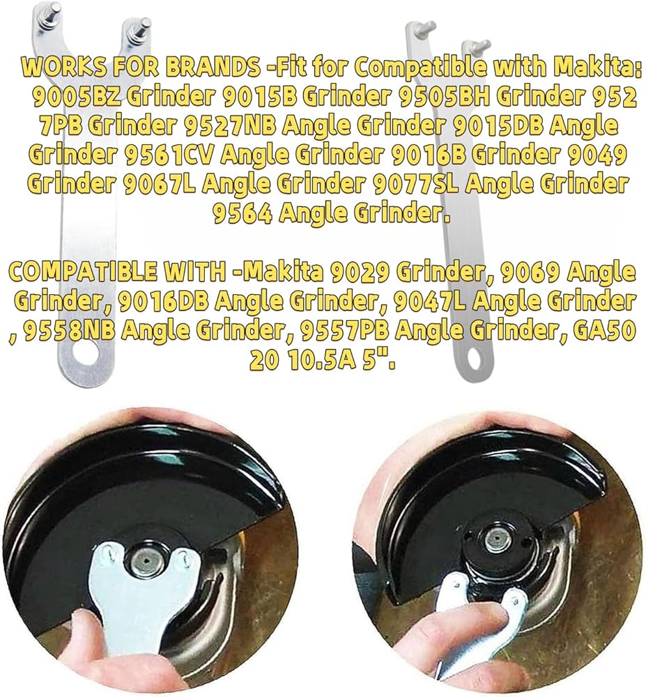 UNIVERSAL FIT-Angle Grinder Spanner Wrench for Compatible with Dewalt Bosch Black & Decker WORKS FOR BRANDS -Fit for Compatible with Makita: 9005BZ Grinder 9015B Grinder 9505BH Grinder 9527PB Grinder 9527NB Angle Grinder 9015DB Angle Grinder 9561CV Angle Grinder 9016B Grinder 9049 Grinder 9067L Angle Grinder 9077SL Angle Grinder 9564 Angle Grinder PART NUMBER - Makita GA7021 Angle Grinder, GA9040S 9" 15A Soft-Start Technology Angle Grinder, GA5010Z 10.5A 5" Angle Grinder, 9564PC 4-1/2" SJS Angle Grinder, 9557NB Angle Grinder, 9558PB Angle Grinder, GA6020 6" Angle Grinder, 9005B Grinder, 9503BH Grinder, 9524NB Grinder, 9528PB Grinder, 9528NB Angle Grinder, 9565CV Angle Grinder, 9564CV Angle Grinder