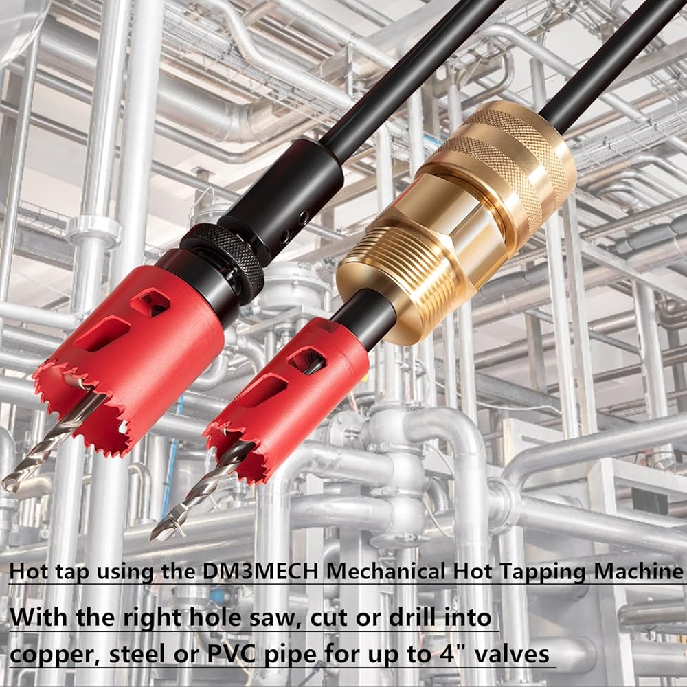 • Application – Hot tap using the DM3MECH Mechanical Hot Tapping Machine. With the right hole saw, cut or drill into copper, steel, or pvc pipe for installing branch connections from 3/4” to 4” valves.