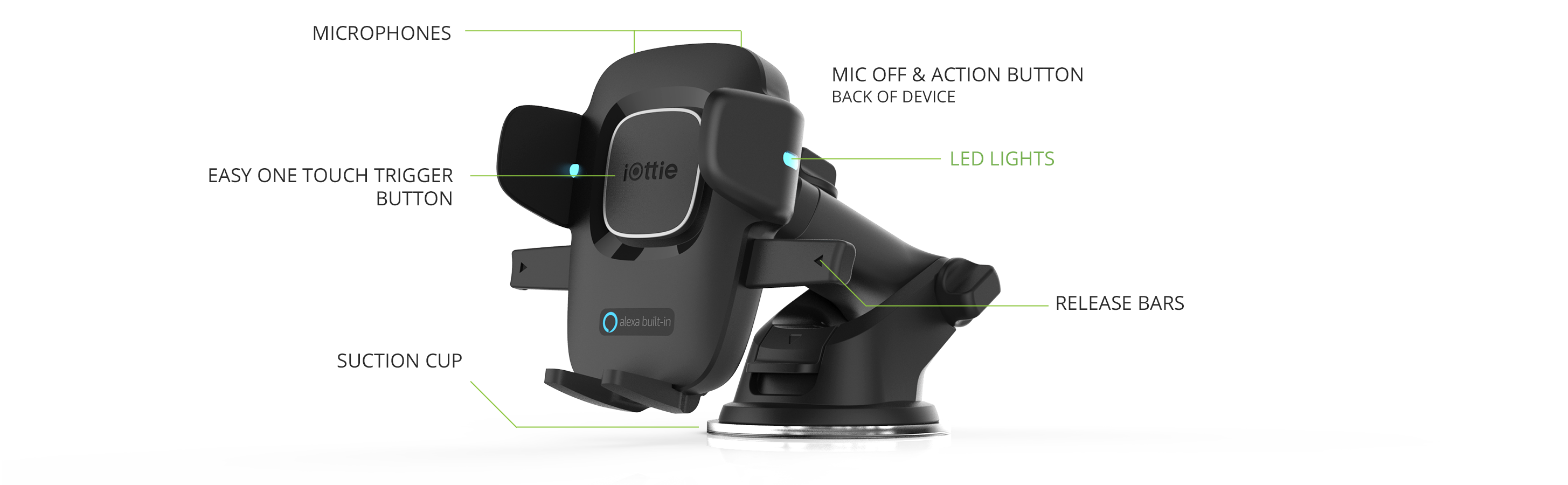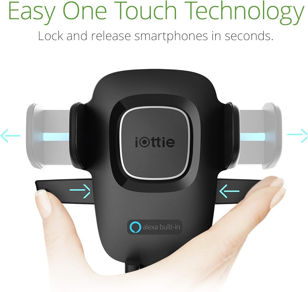 To use easy One Touch connect, simply mount the smartphone with the Alexa app installed, and speak to Alexa within an arm's reach. The seamless communication with Alexa is powered by dual-microphones and noise canceling software that filters out ambient road noises for a superior Alexa experience on the go. The iOttie easy One Touch connect with Alexa built-in adds intelligence and performance to any vehicle for safer and smarter driving on any road. Technical Specifications Alexa built-in: access tens of thousands of skills including driving directions, music, hands-free calls, smart home automation, and more. Voice isolation: 2 High-quality microphones reduce road noise and isolate voice commands with maximum accuracy. Privacy: tap the mic off and action button on the back to mute Alexa. Patented easy One Touch: LOCK and release smartphones with one hand motion. iOttie Connect (app) Alexa (app).