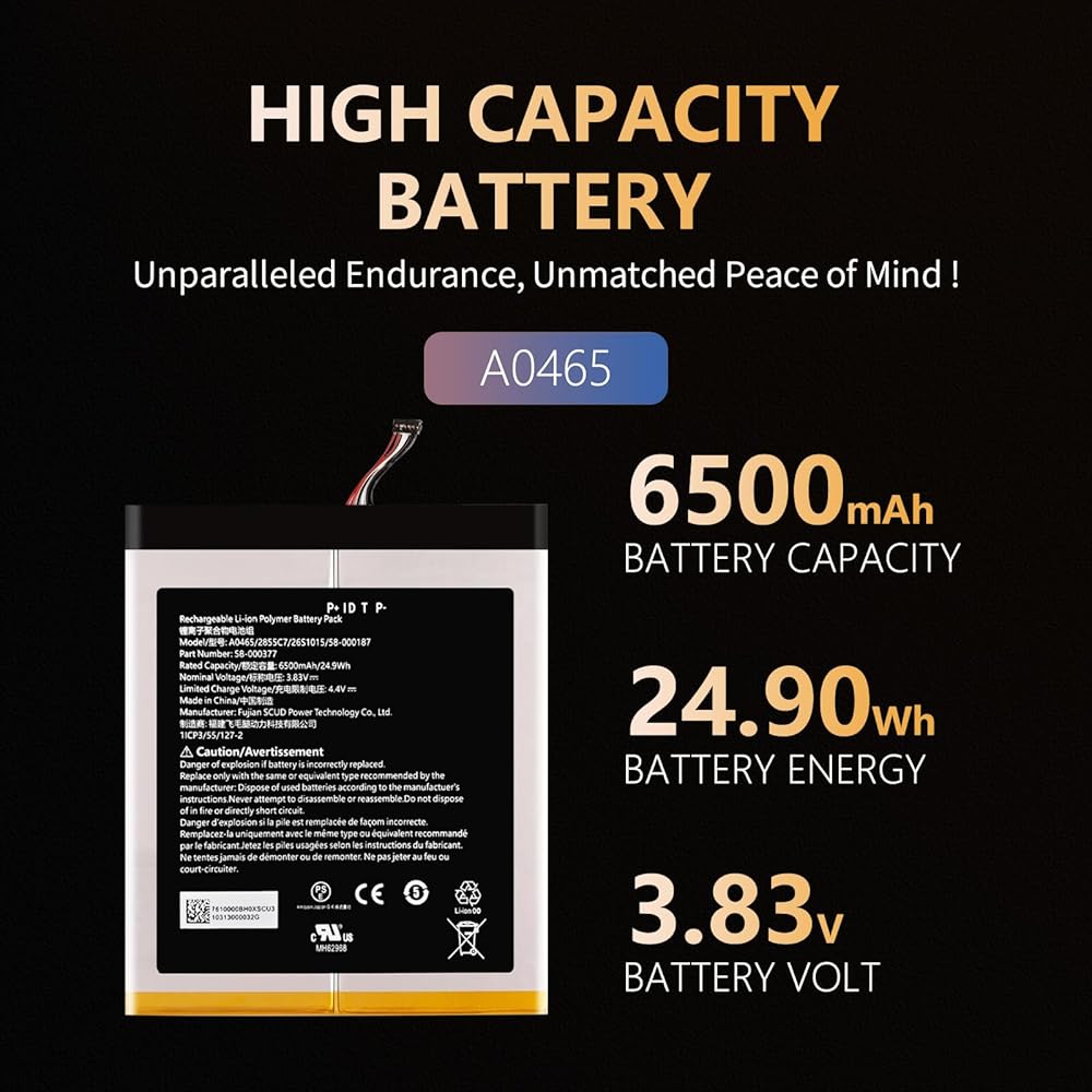 【نموذج متوافق مع البطارية】: بطارية بوليمر عالية السعة 6500 مللي أمبير في الساعة تتوافق بنسبة 100 ٪ مع Amazon Fire HD 10th Gen 10.1 "SL056ZE Tablet (طراز 2017)
