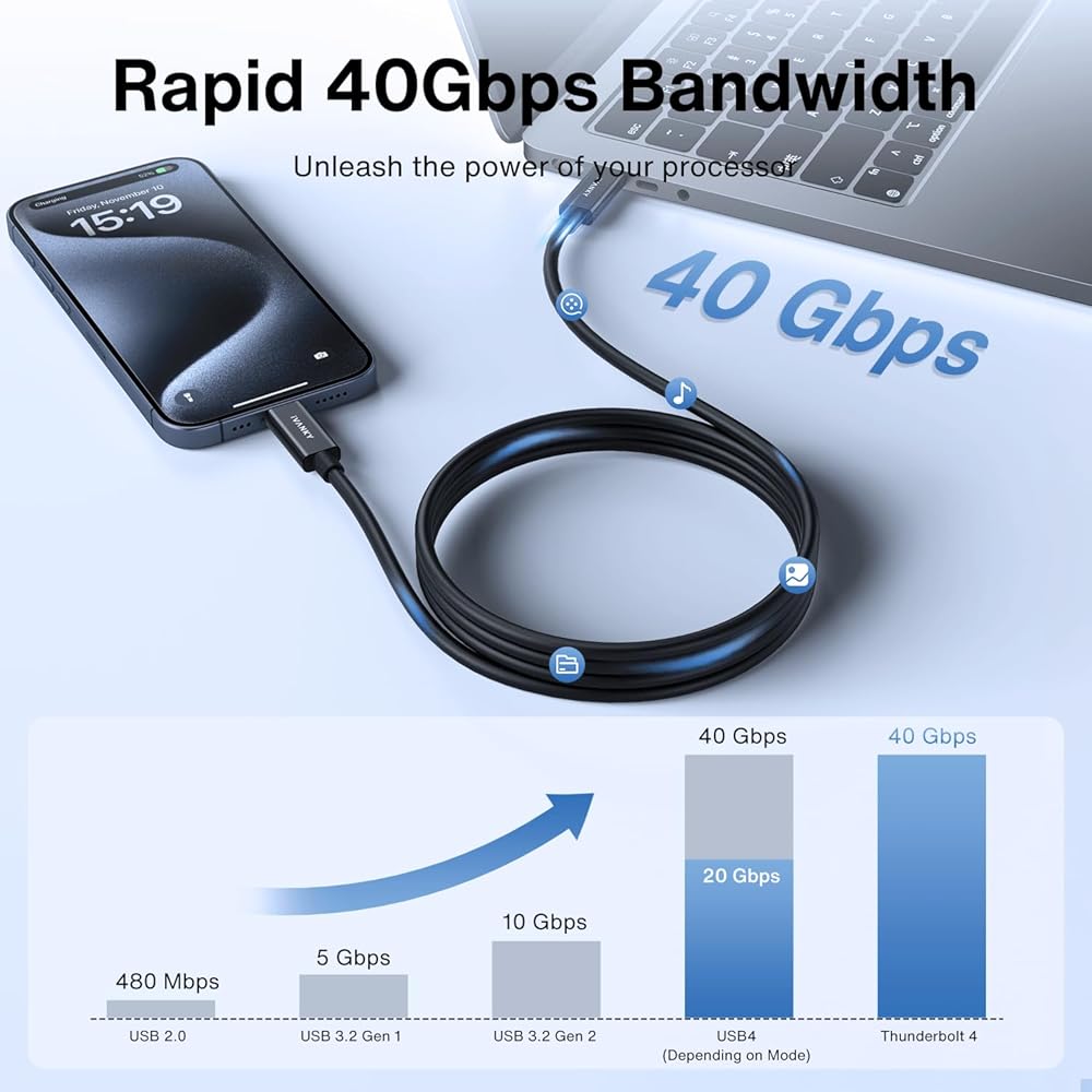 Ivanky Thunderbolt 4 Cable 4.9ft [Intel Certified] ، دعم شحن 40 جيجابت في الثانية/240 واط/8K ، متوافق مع كابل USB4 ، Thunderbolt 3 ، مرن USB C إلى USB C كبل iPhone 16/15 ، MacBook - 4.9ft