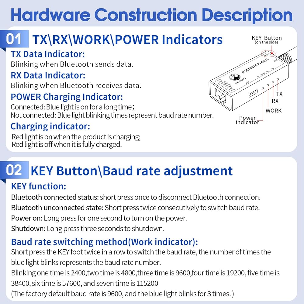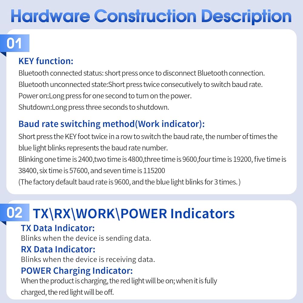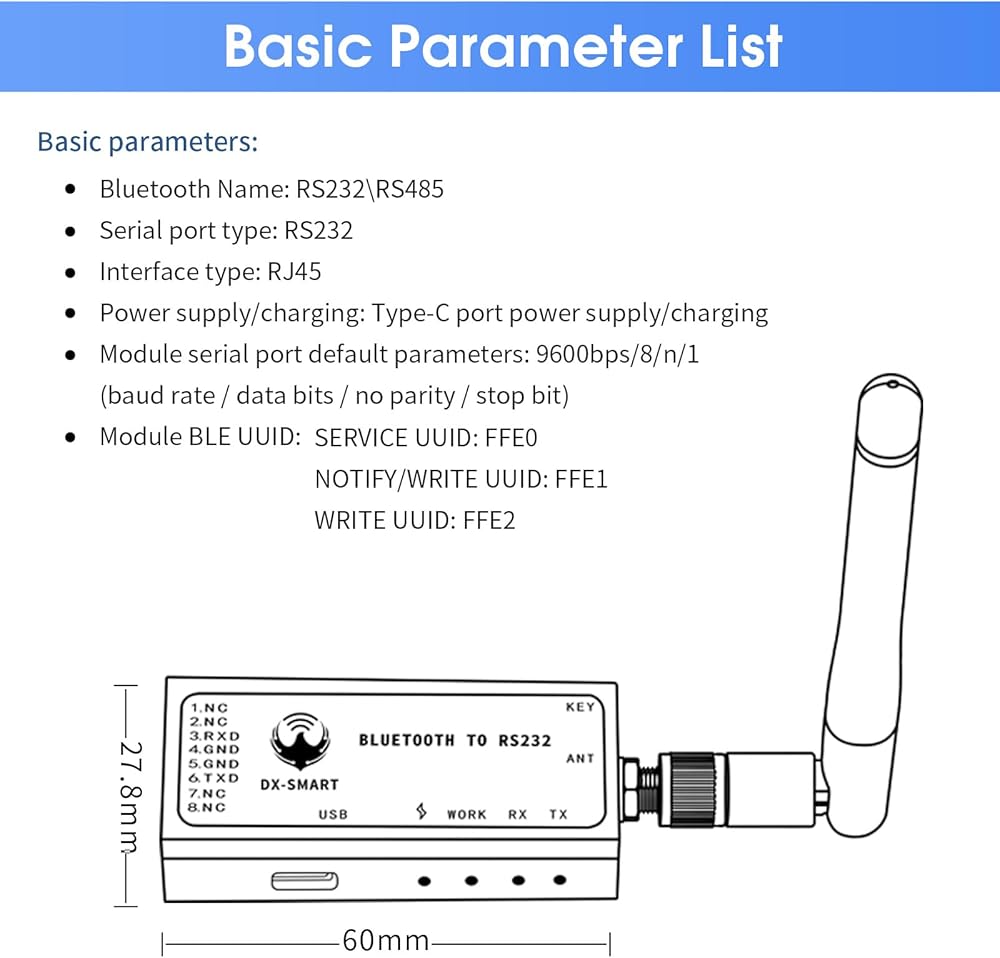 Built-in Bluetooth 5.1 BLE module: enables long-distance wireless communication. Smartphone app/laptop/desktop PC can realize wireless debugging and view 232 device parameters through the adapter.