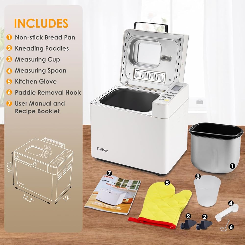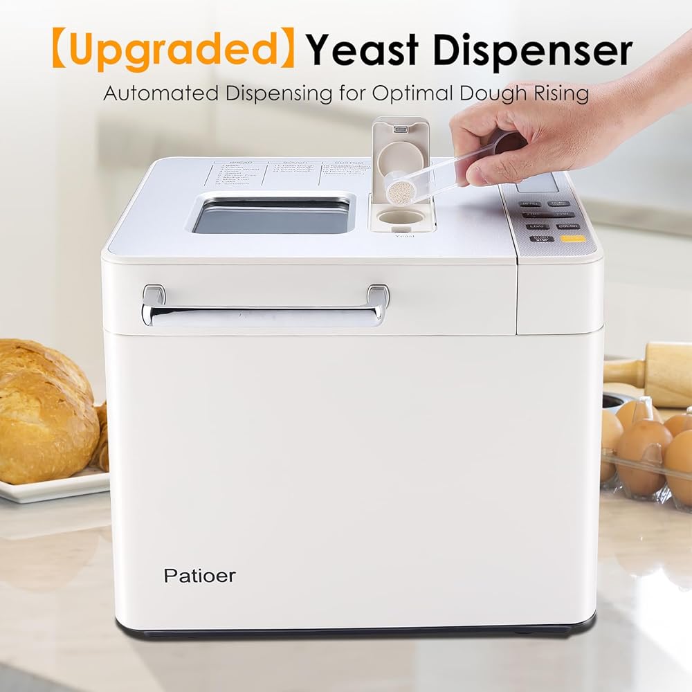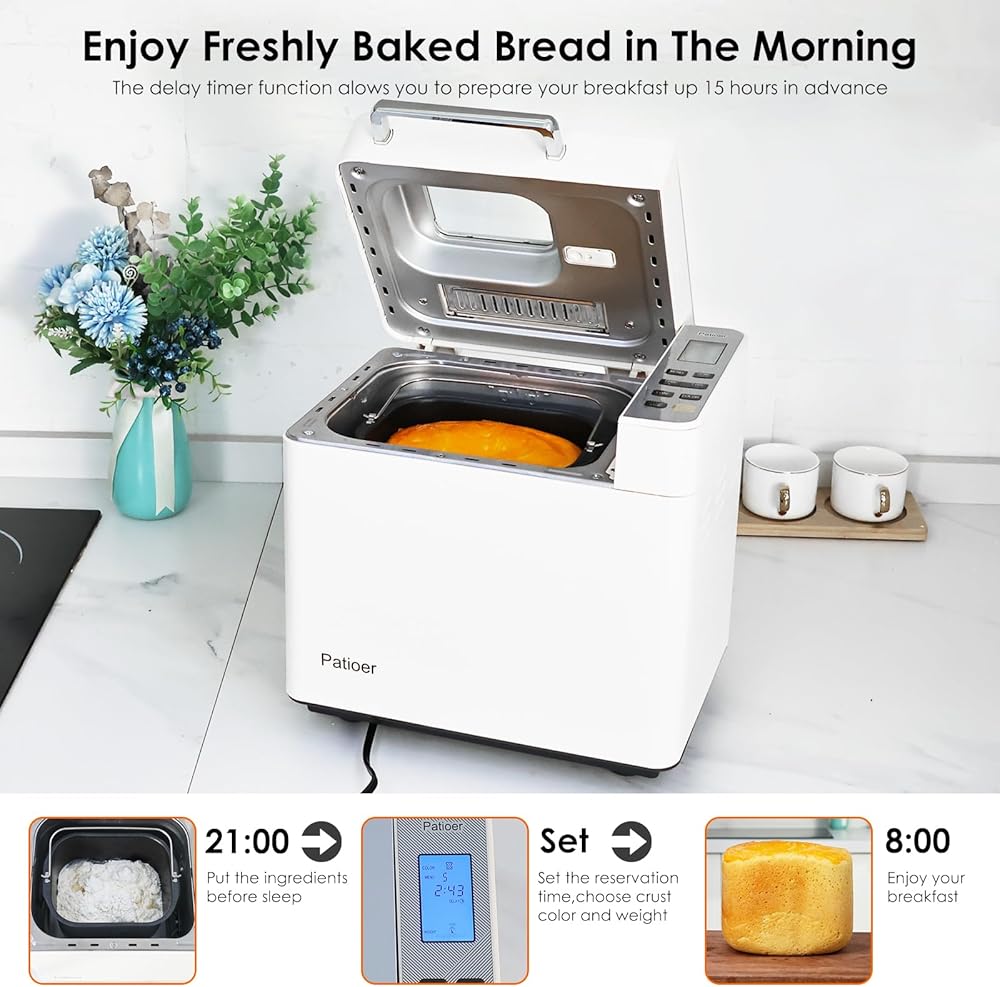 • Mutiple Custimized Programs: The Patioer automatic bread machine boasts 21 versatile programs tailored for French, gluten-free, whole wheat breads, kneading, fermentation, jam, yogurt, cake, and more. Additionally, you can personalize and save up to 3 custom bread recipes via the intuitive 'Homemade' program.