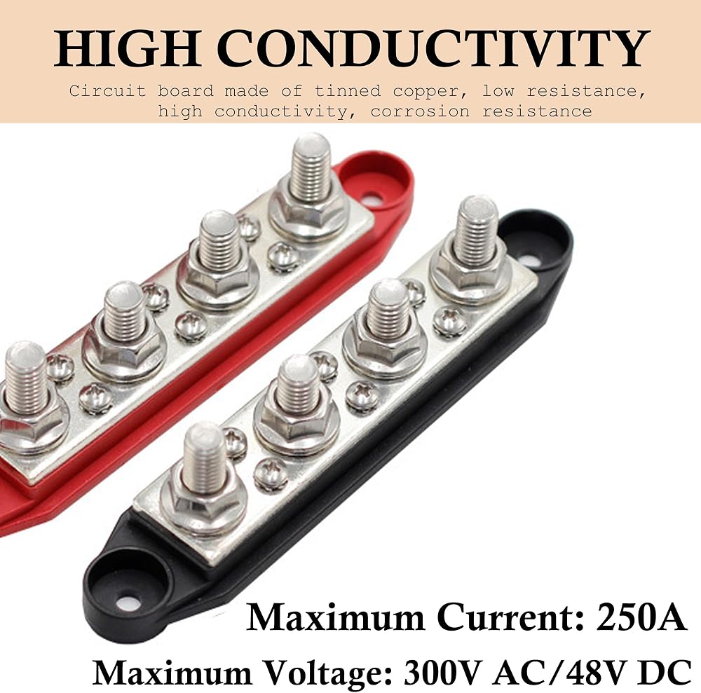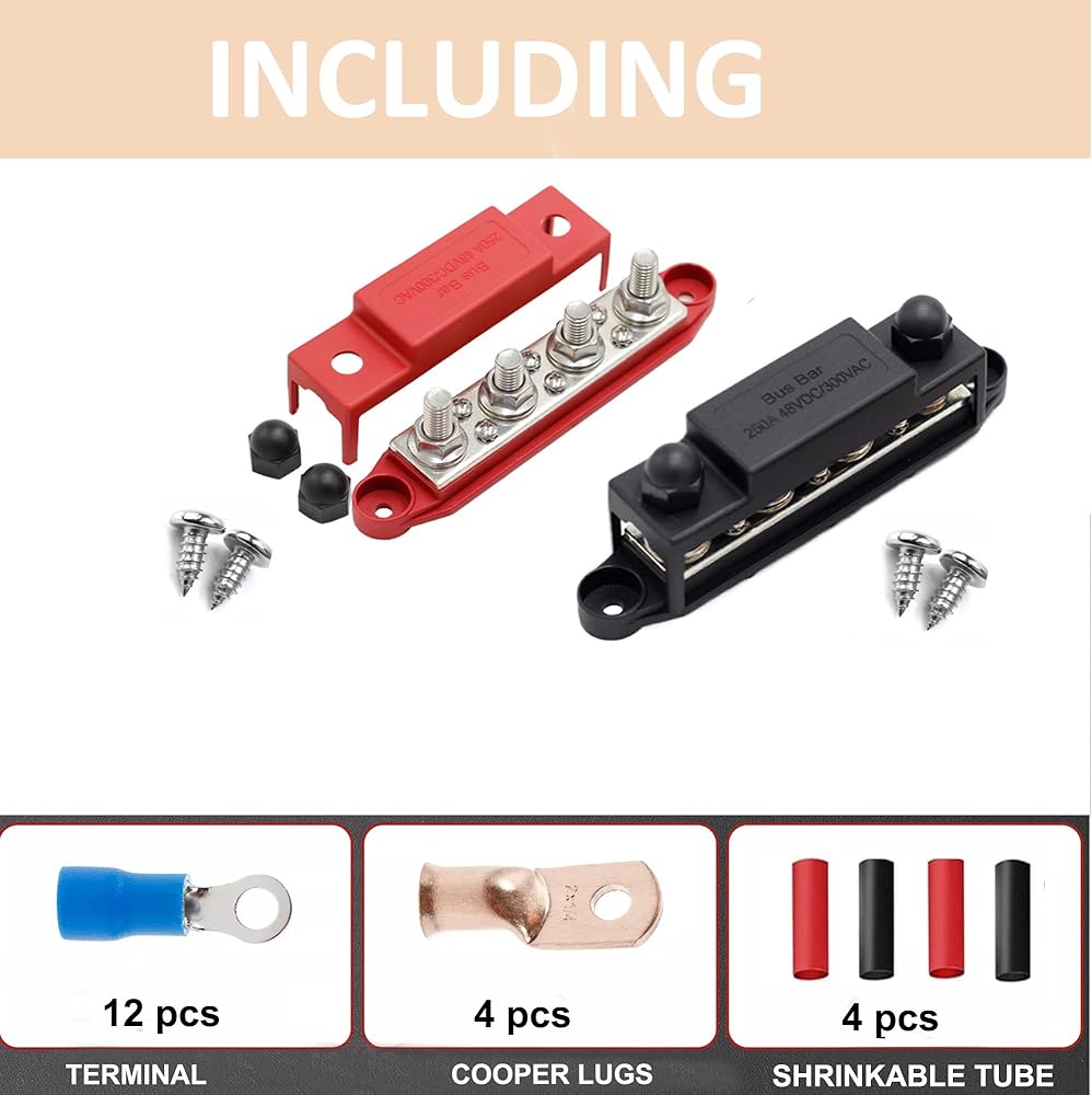 Package Includes: 1 PCS Black and 1 PCS red power distribution block, 4 pcs silicone terminal covers, 4 pcs copper lugs, and 12 pcs ring tongue terminals, 4 heat shrinkable tube