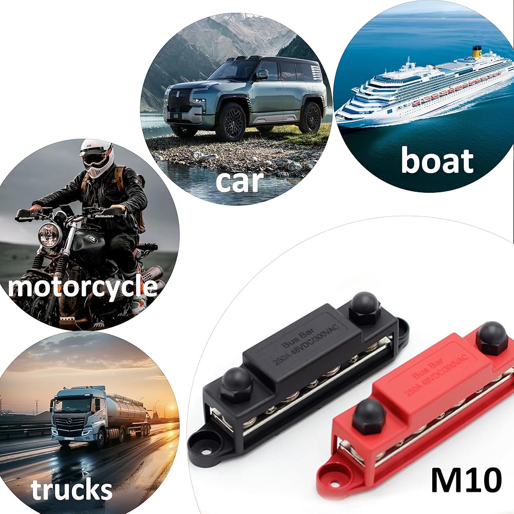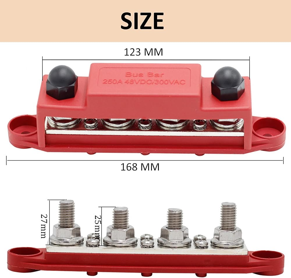 Size: The bus bar includes 4 x 3/8" (M10) studs, and 6 x M4 (#8) screw terminals, equipped with ring tongue terminals, the bus bar handles the high current effortlessly, ensuring stable power distribution across the setup